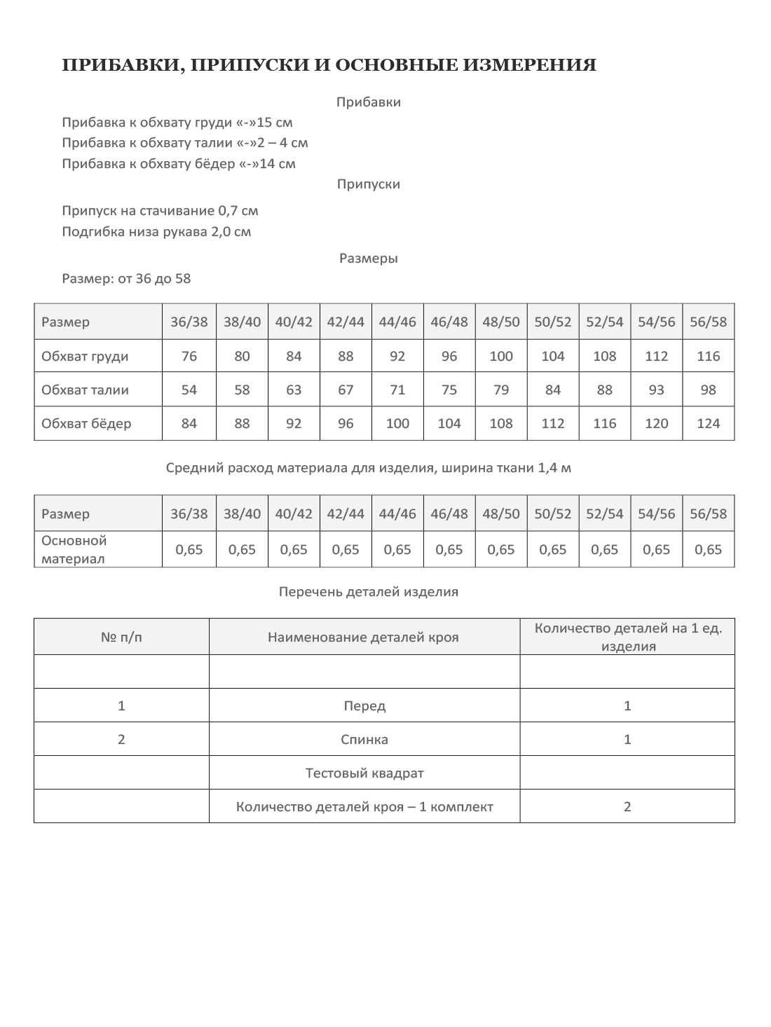 Техническая документация к лекалу включает в себя: описание пошива, прибавки, припуски и основные измерения в модели, средний расход материалов, раскладку на ткани.