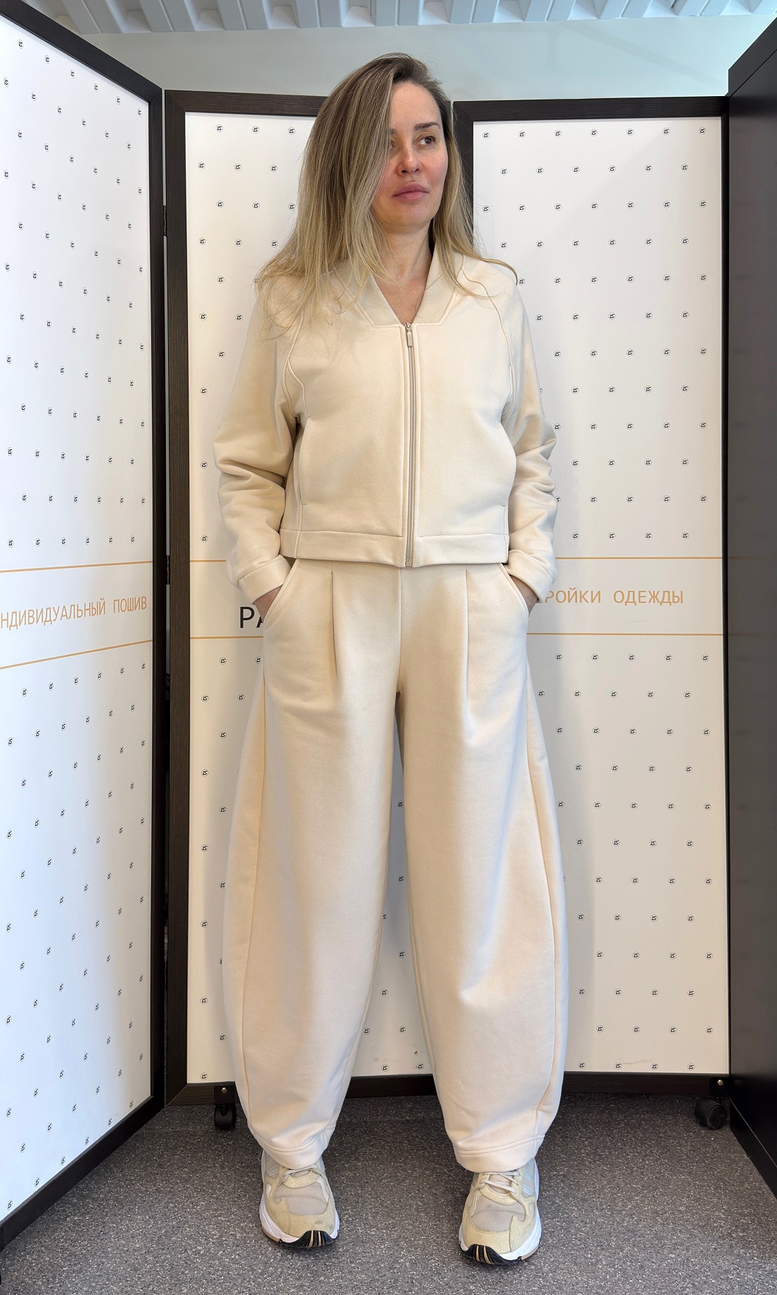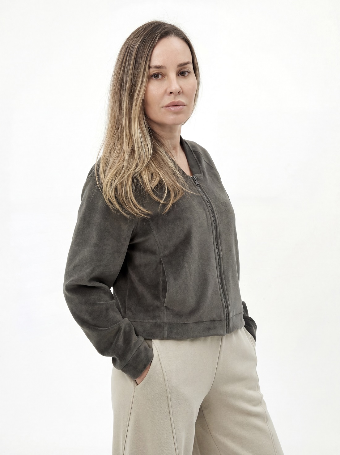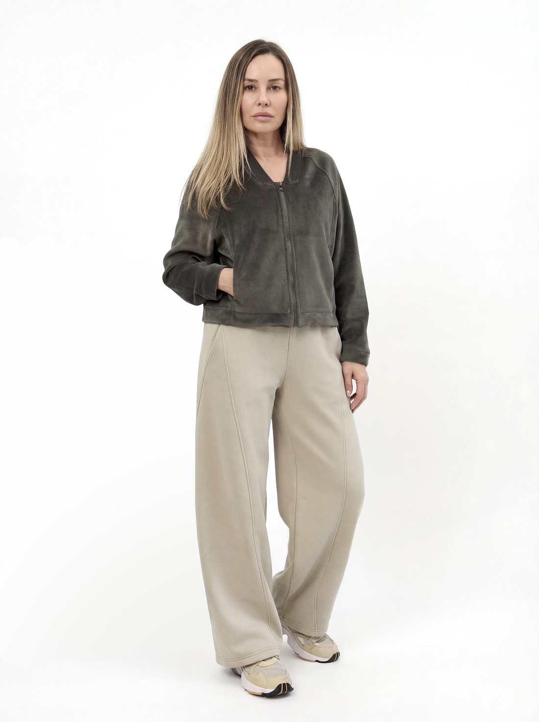 Модель умеренного объема. Рукав реглан с углубленной проймой и вытачкой на плече. Низ рукава обработан подгибом с вставкой из кашкорсе, аналогичным образом оформлен и низ бомбера по спинке. Передняя часть изделия имеет рельефные швы, в которых расположены карманы. Модель укороченная, немного ниже линии талии. Застежка на молнии. В конструкции предусмотрен вариант с коротким рукавом, который отлично подходит для пошива из теплых тканей, а также из легких летних материалов, где короткий рукав будет особенно актуален.