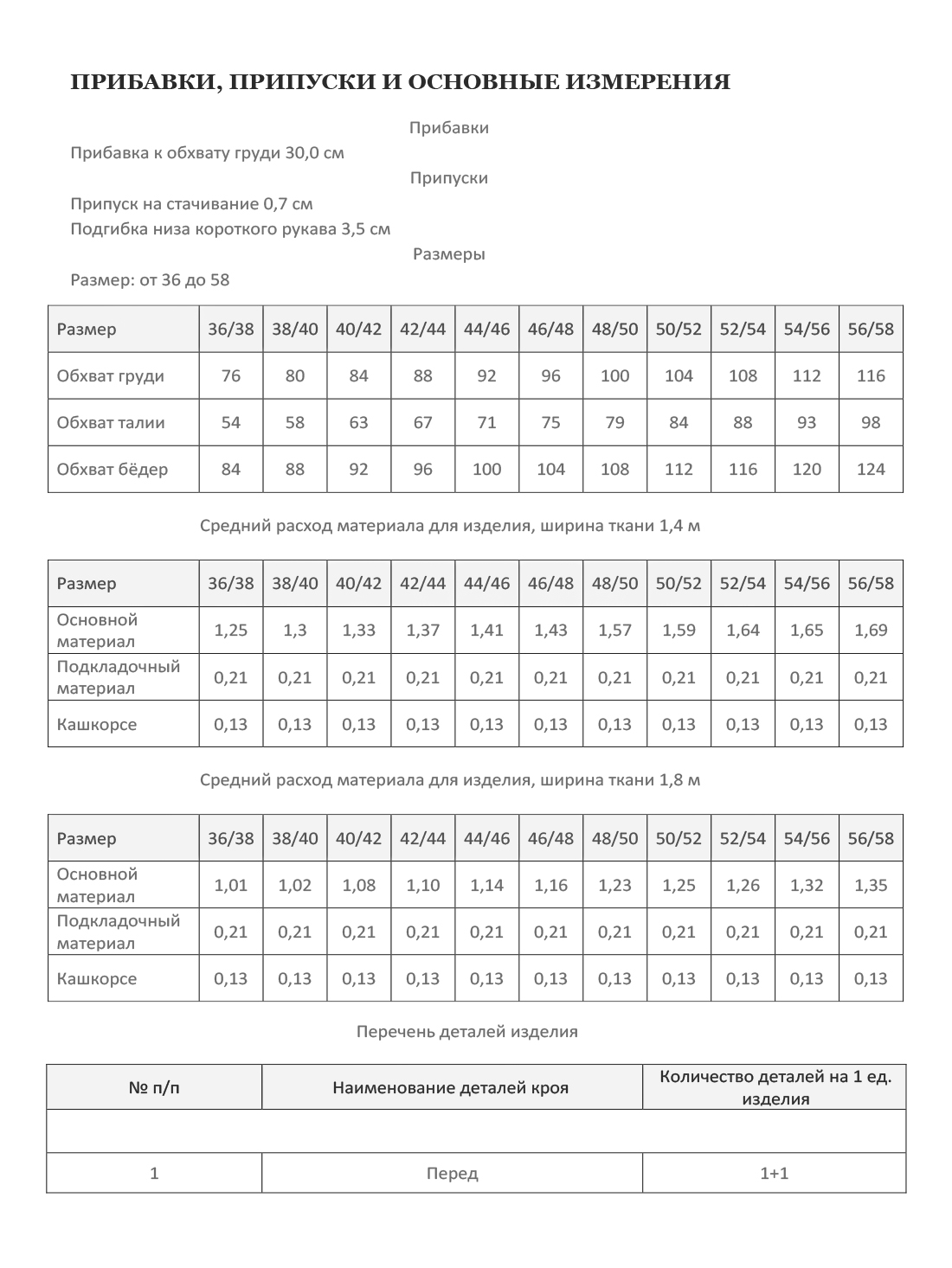 Техническая документация к лекалу включает в себя: описание пошива, прибавки, припуски и основные измерения в модели, средний расход материалов, раскладку на ткани.