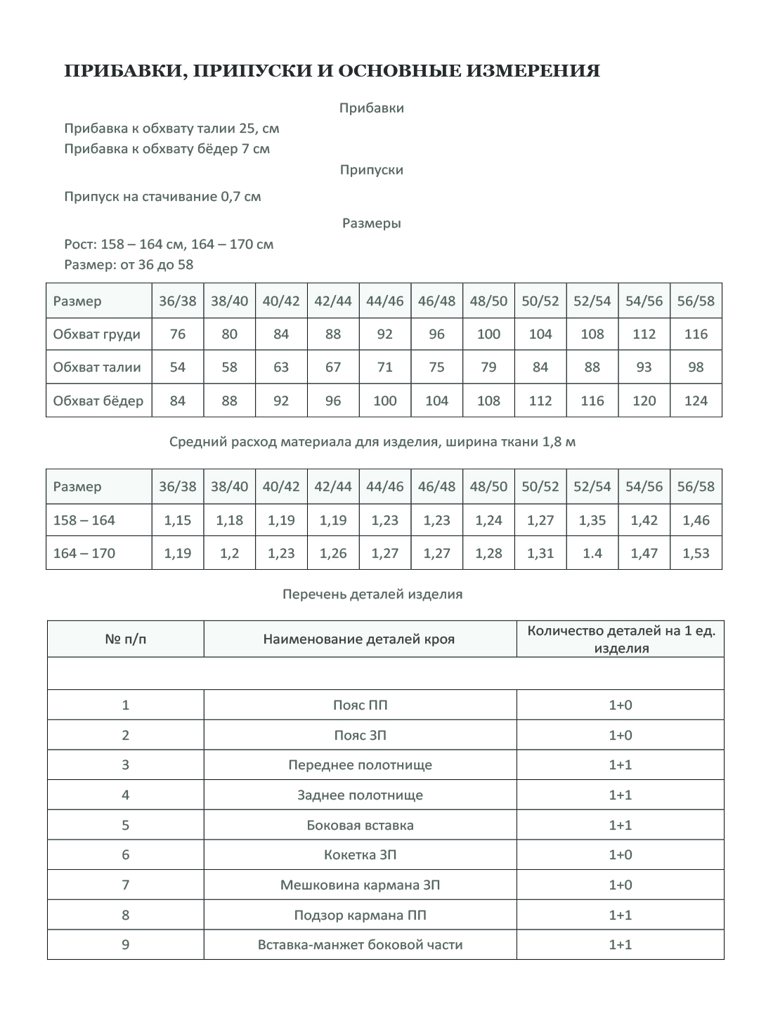 Техническая документация к лекалу включает в себя: описание пошива, прибавки, припуски и основные измерения в модели, средний расход материалов, раскладку на ткани.