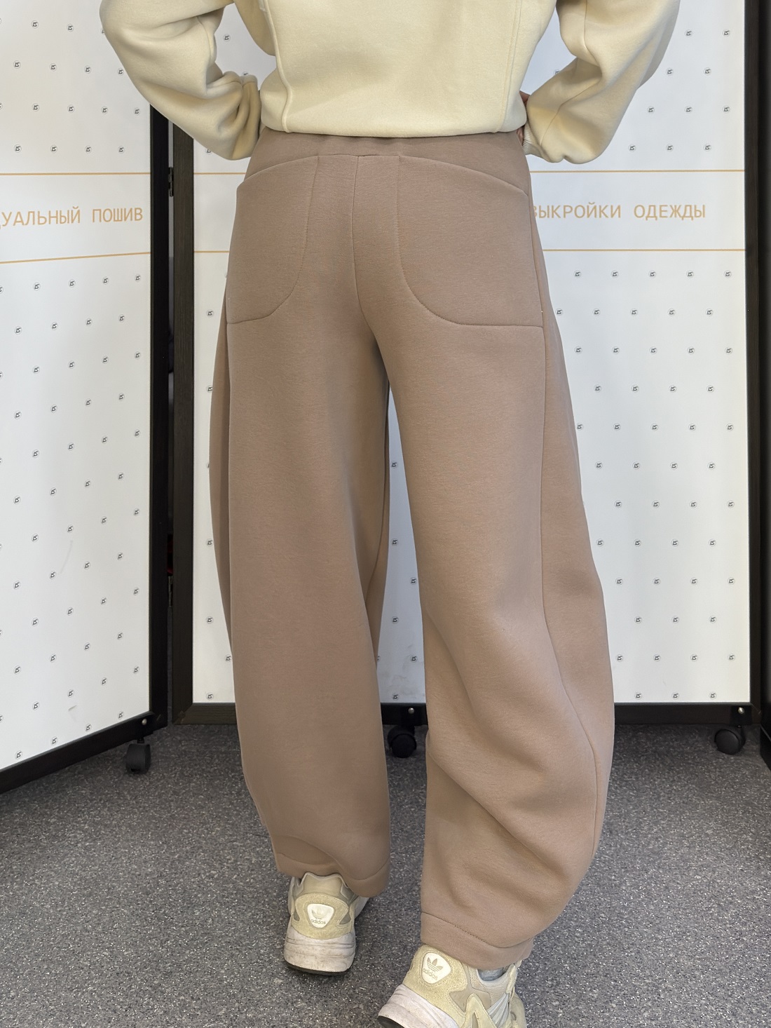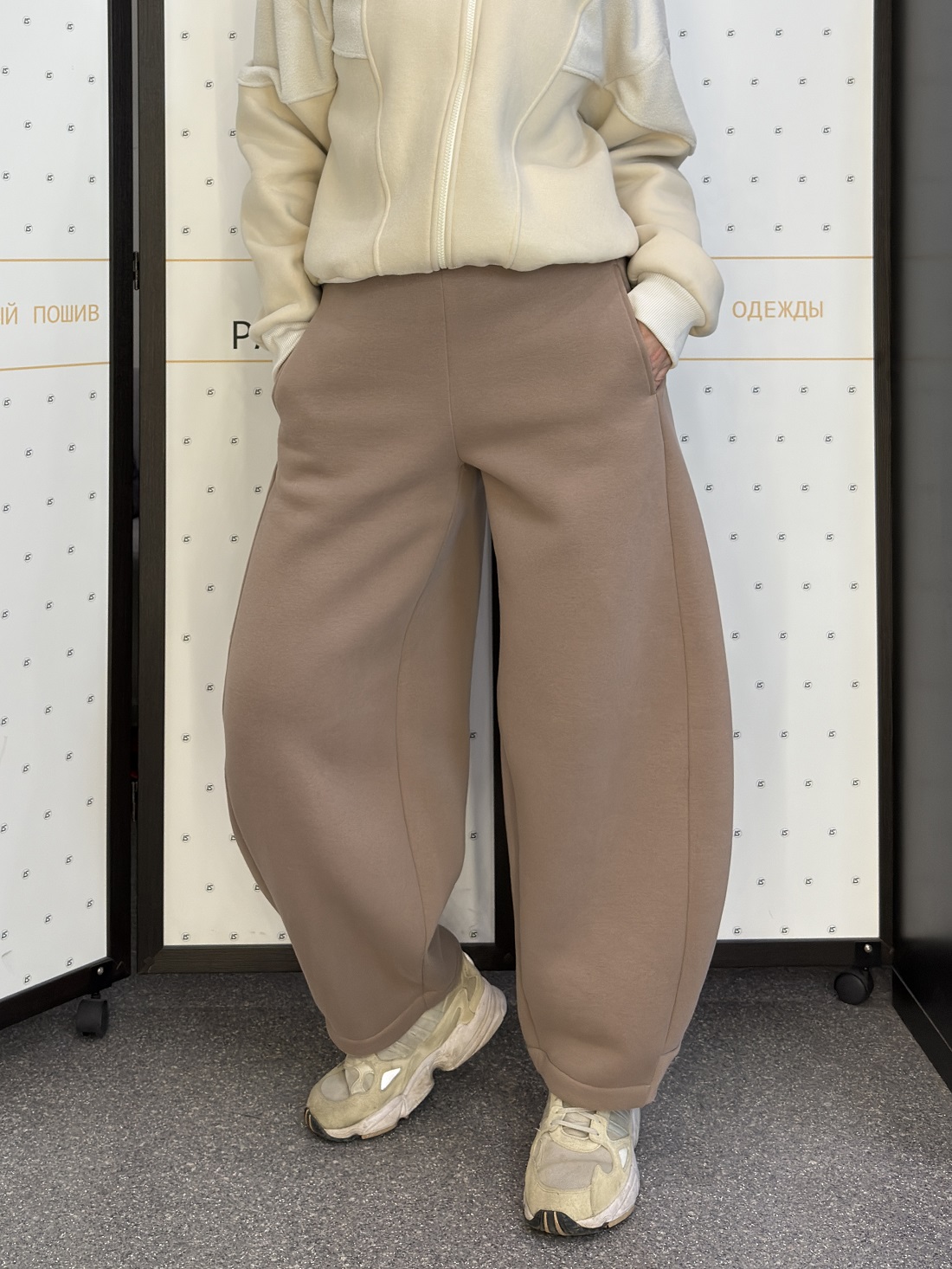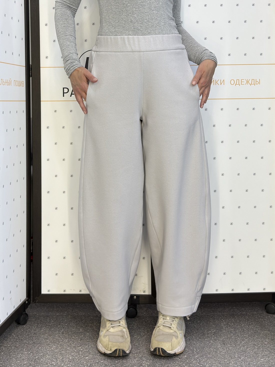 На фото представлены два варианта: серые брюки из тонкой пальтовой ткани и модель цвета капучино из футера трёхнитки с начёсом. Обе модели выполнены в размере 44/46.