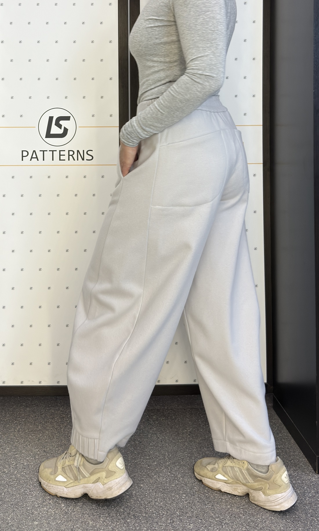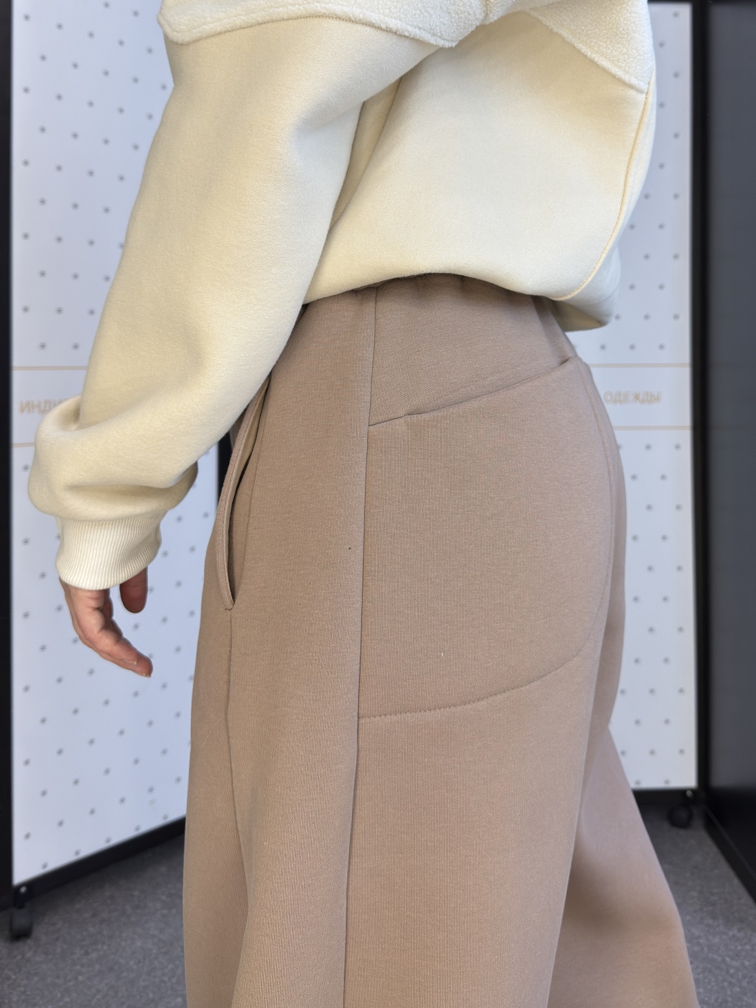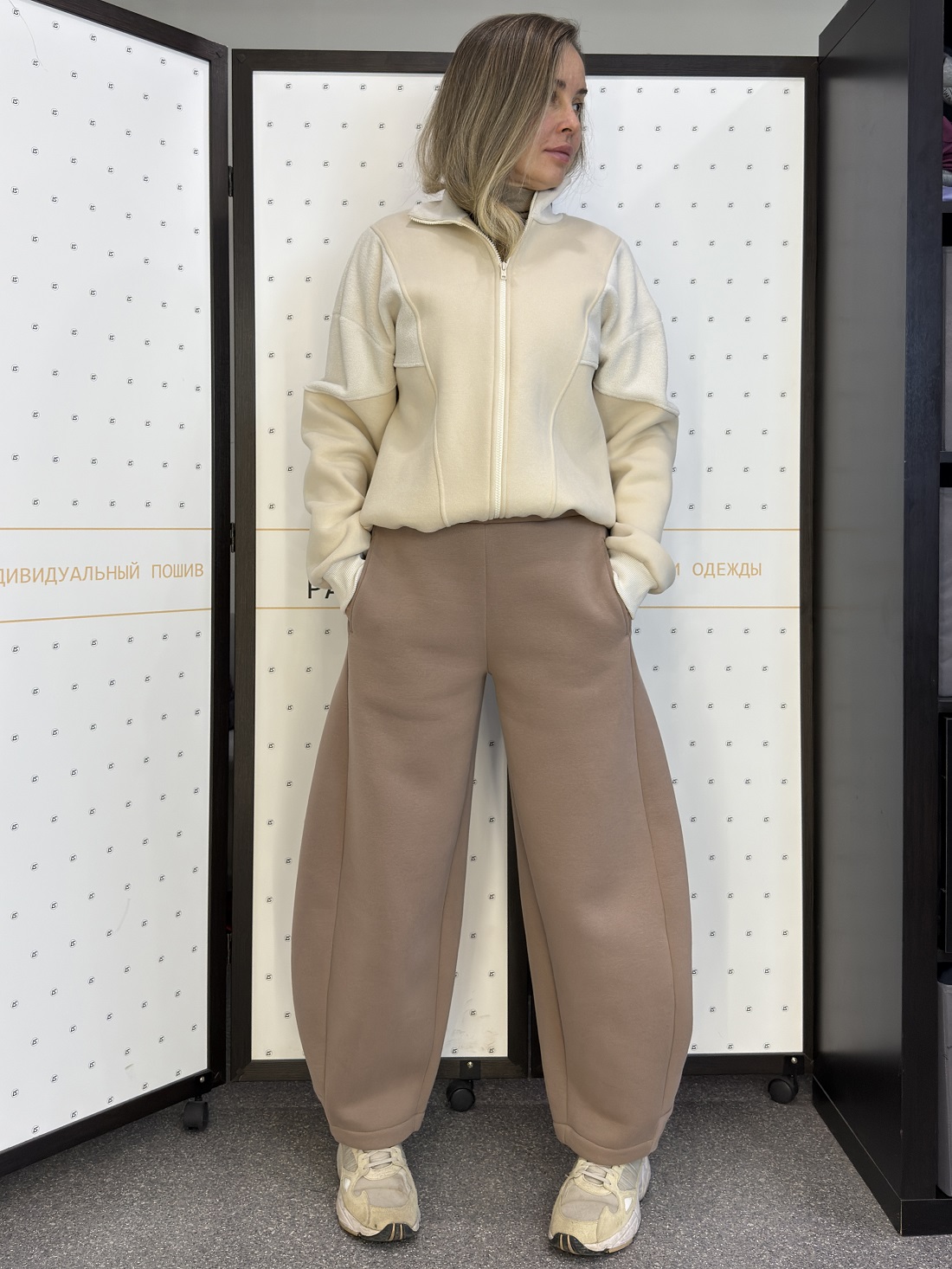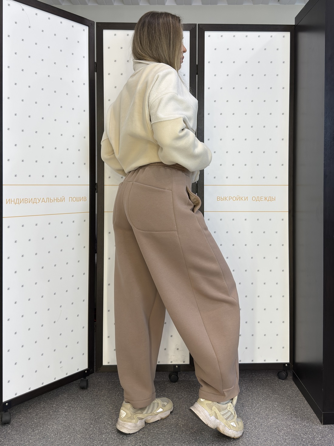 На фото представлены два варианта: серые брюки из тонкой пальтовой ткани и модель цвета капучино из футера трёхнитки с начёсом. Обе модели выполнены в размере 44/46.
