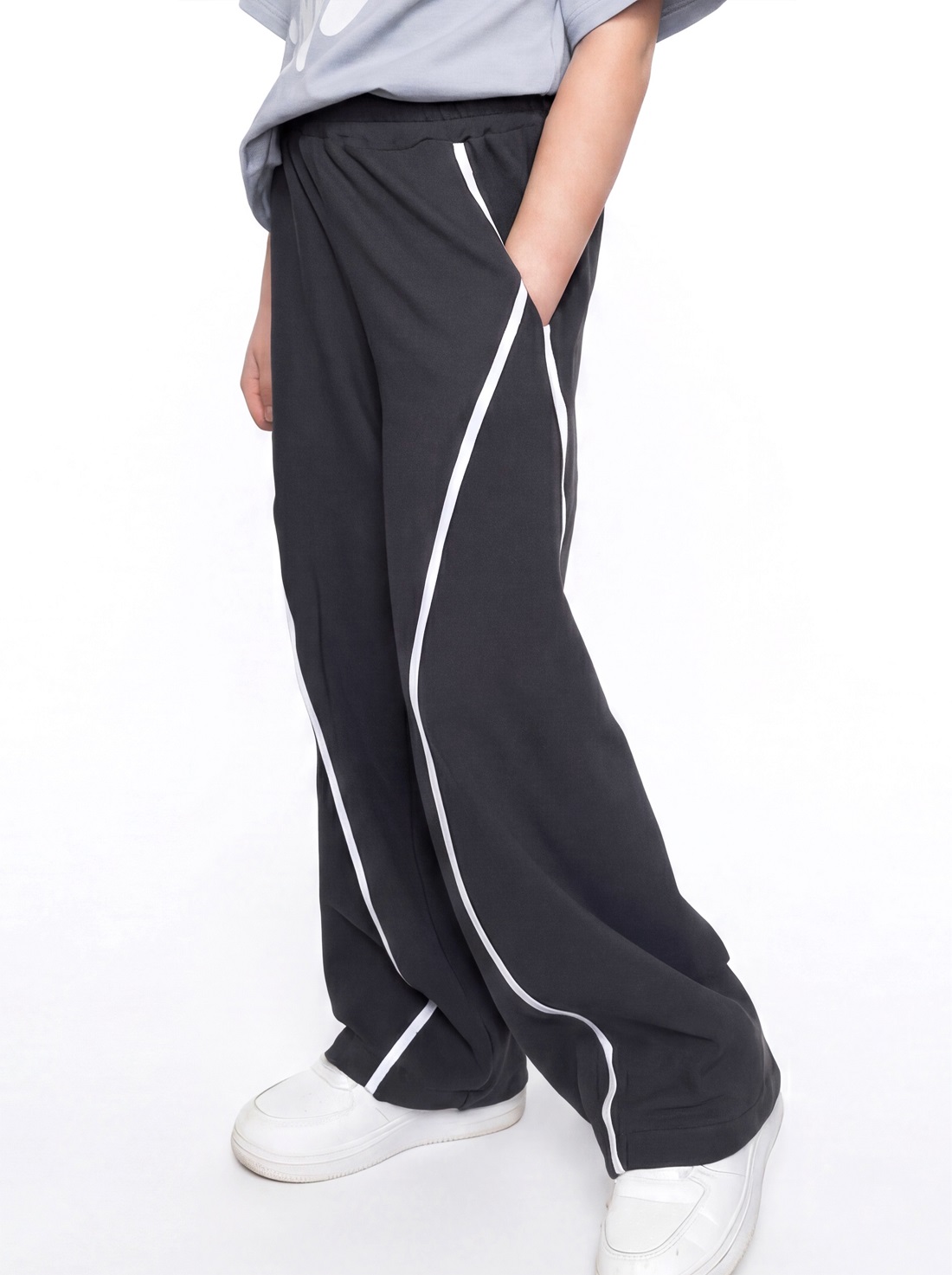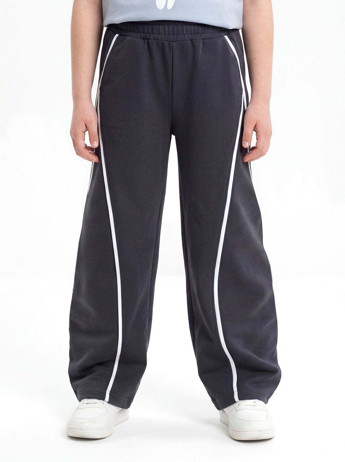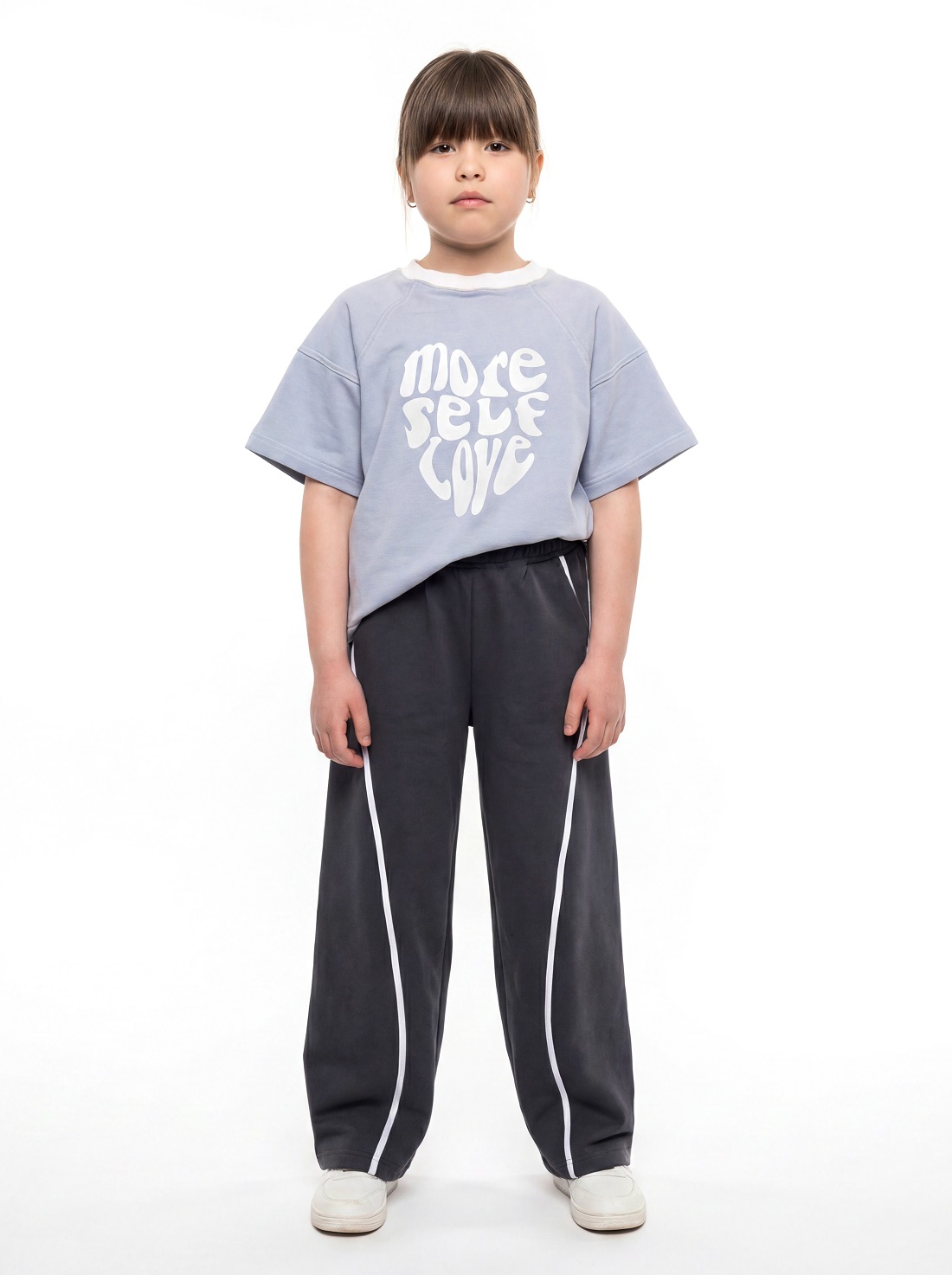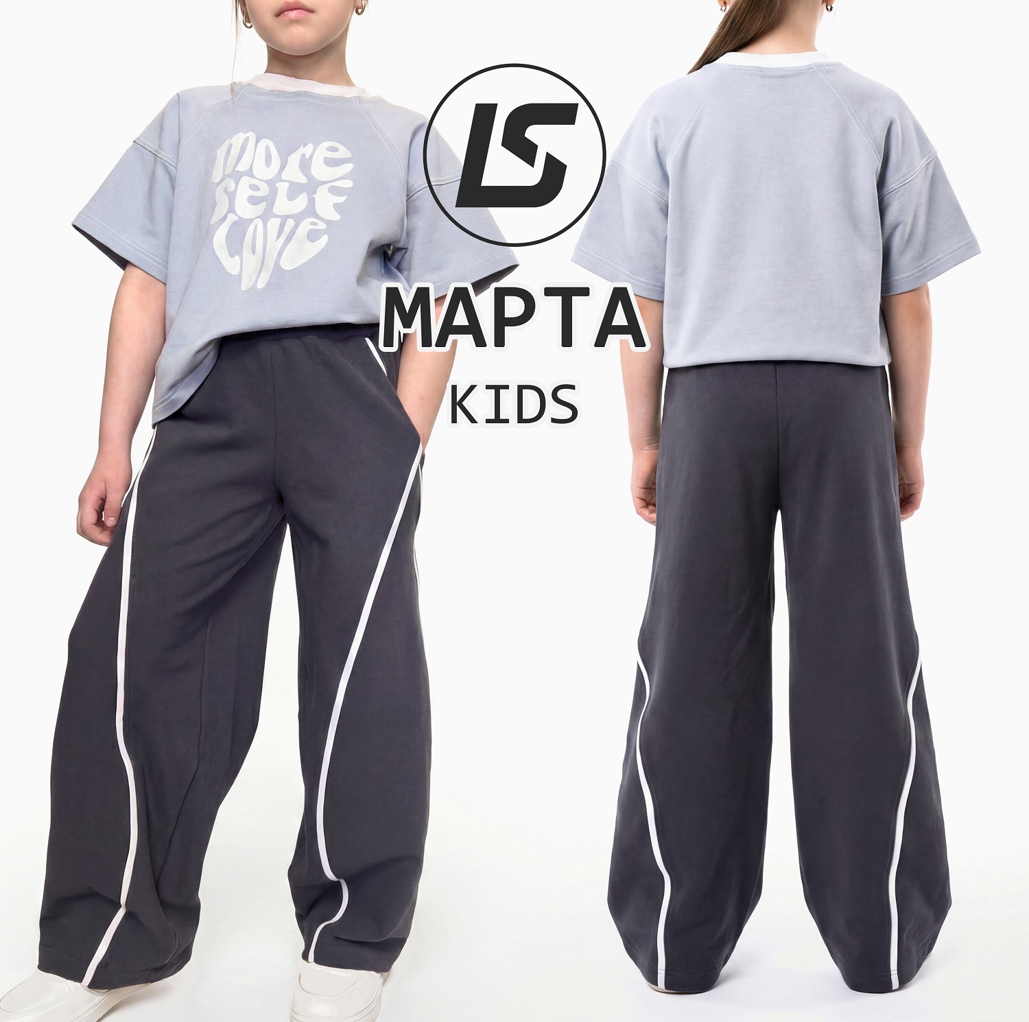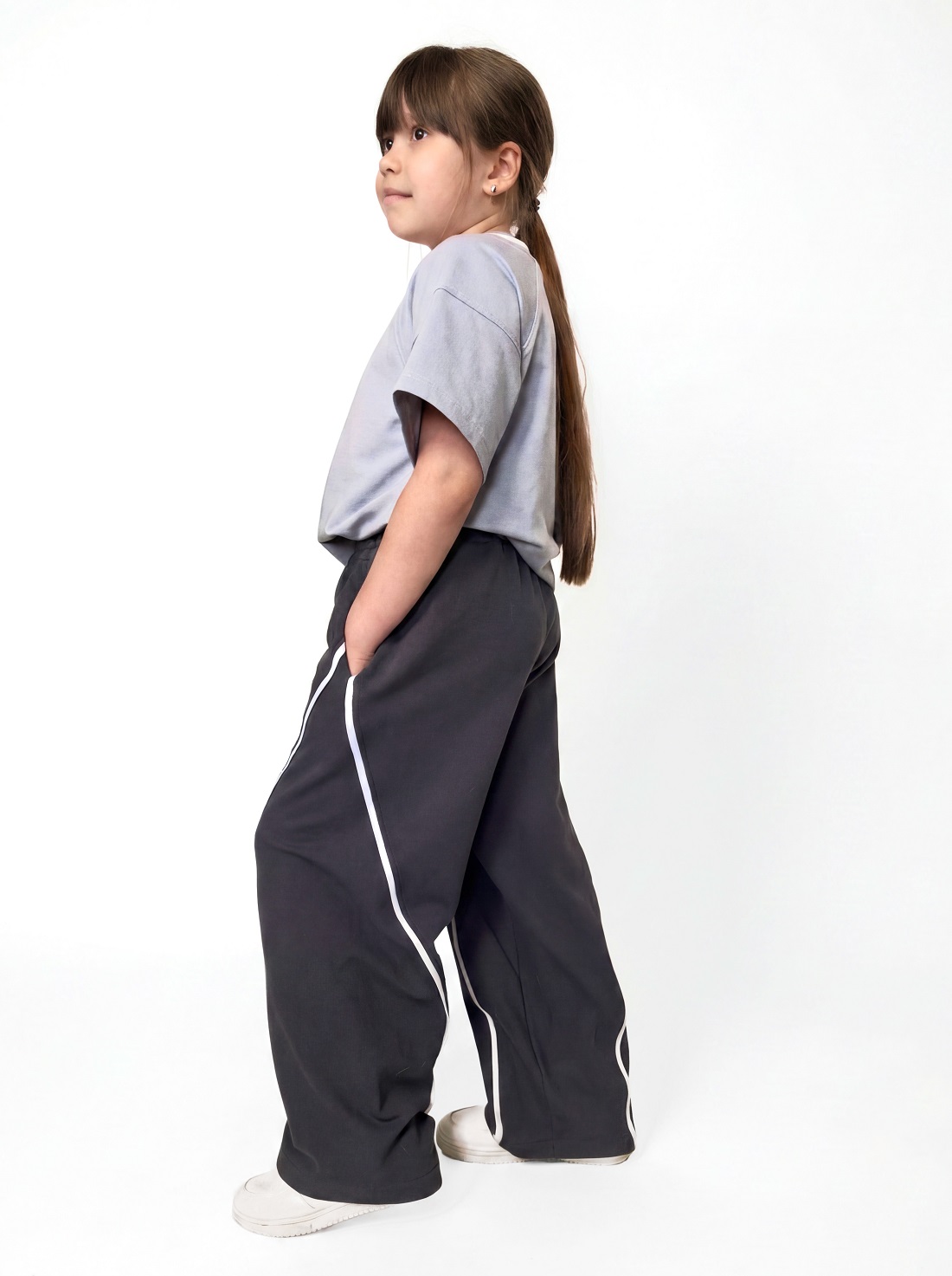 Модель детских брюк умеренного объёма с широкими штанинами, слегка зауженными к линии низа. Характерный O-силуэт формируется за счёт конструктивных линий на передних и задних половинках. На передних половинках в швах расположены удобные карманы. Пояс выполнен на эластичной резинке, он обеспечивает комфортную посадку и удобство при носке. Низ брюк обработан подгибом, при желании можно вставить резинку-утяжку.