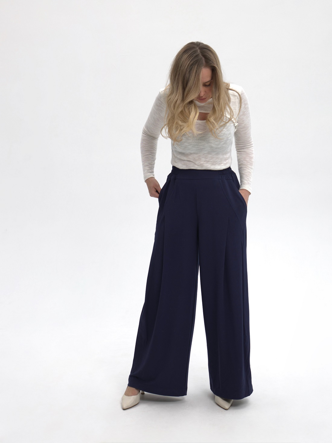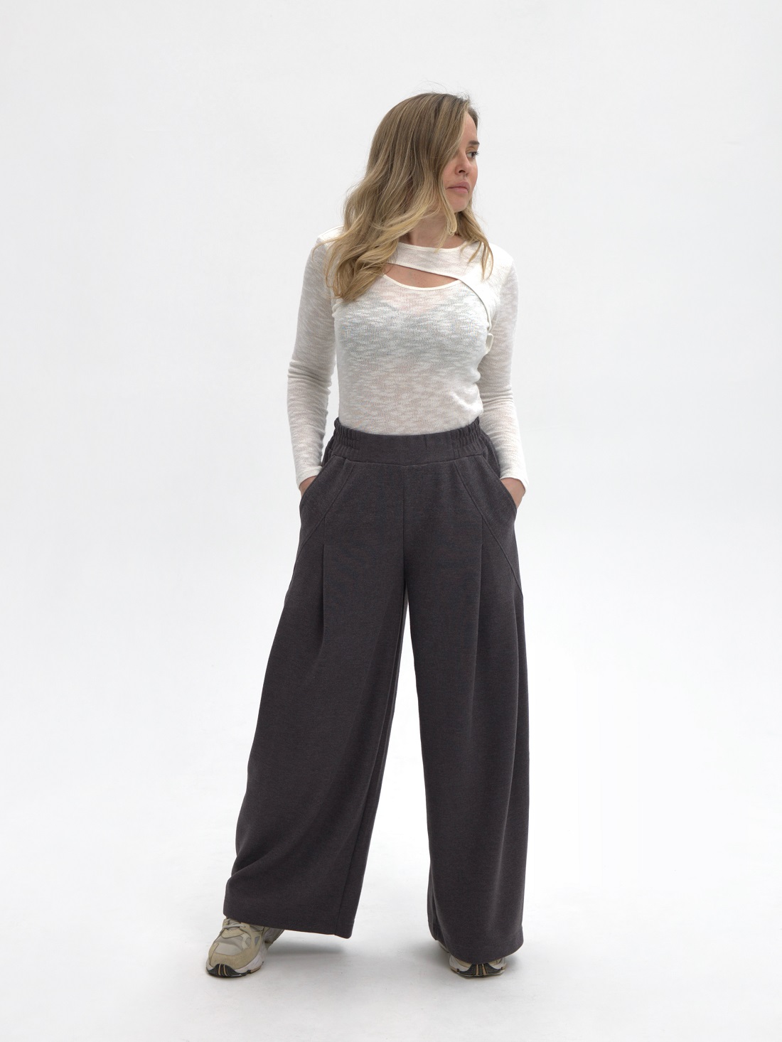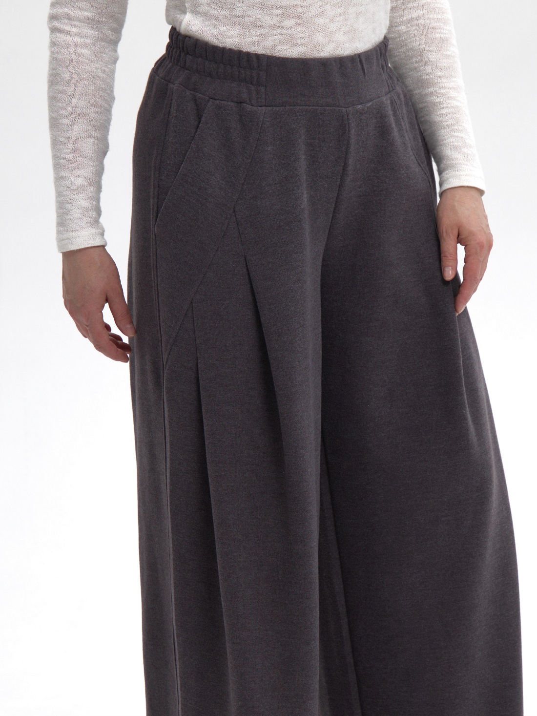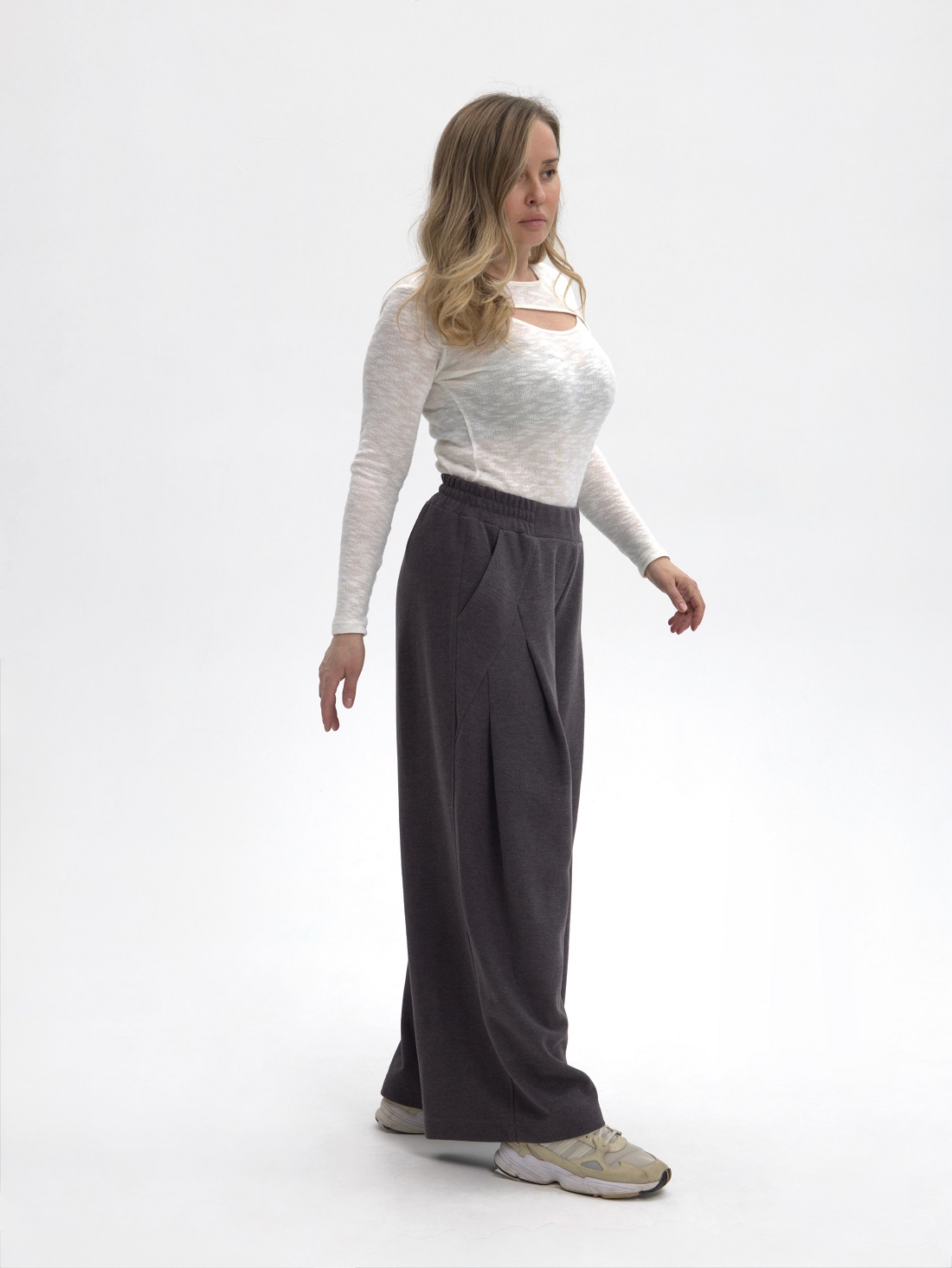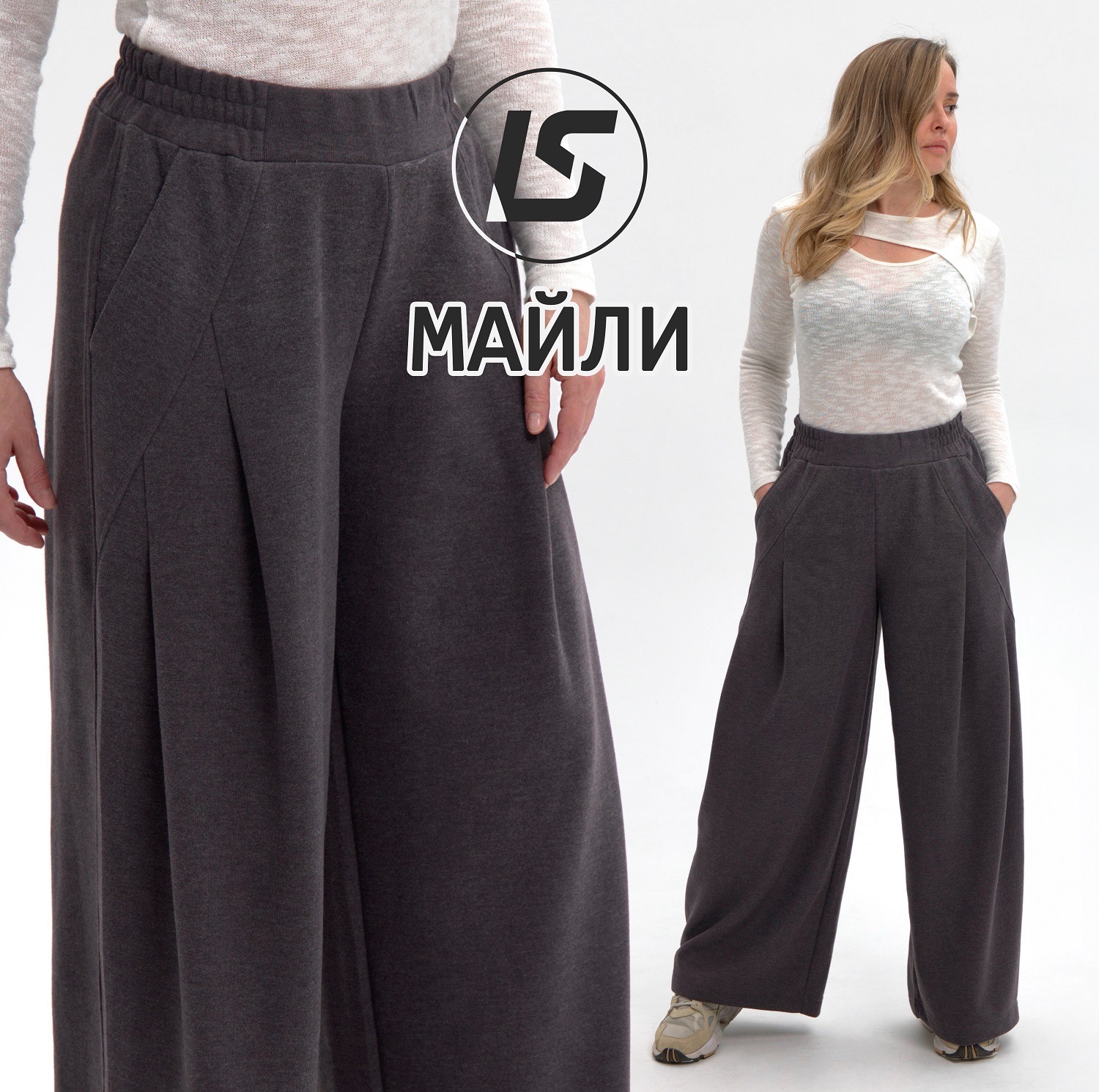 Брюки умеренного объёма с расширением к низу в стиле «палаццо». По переду