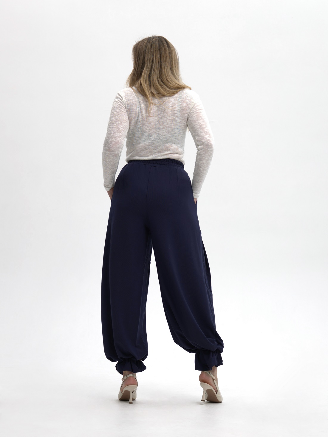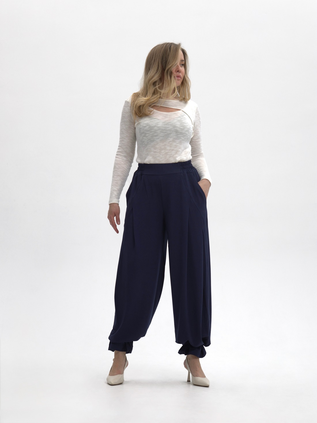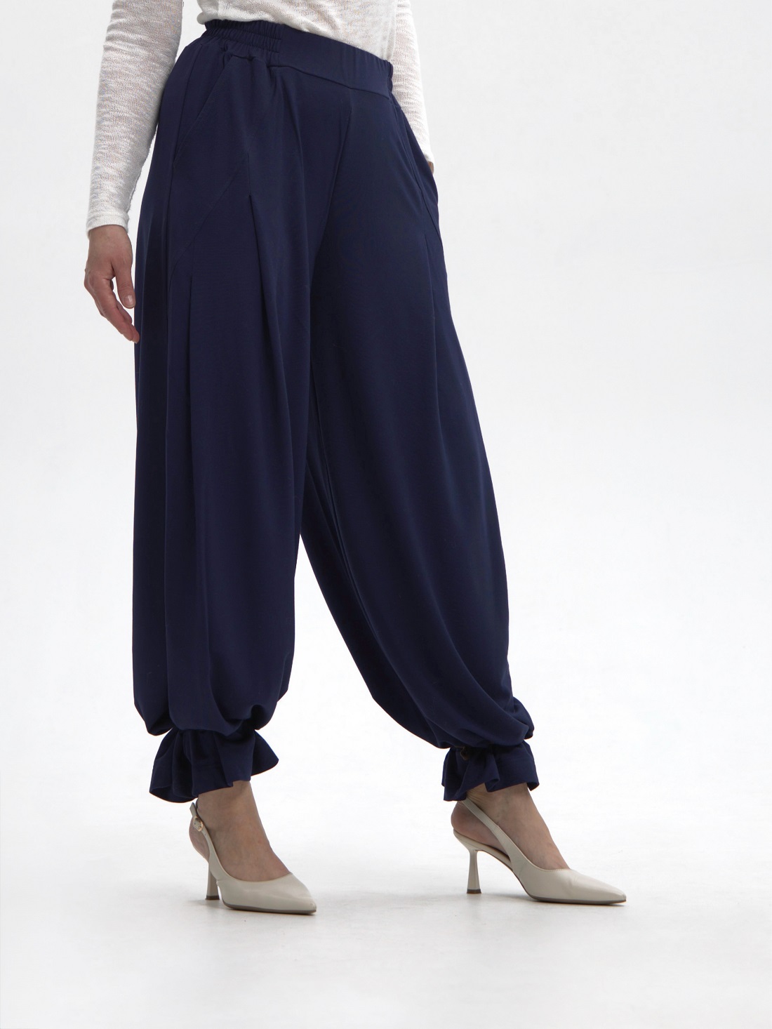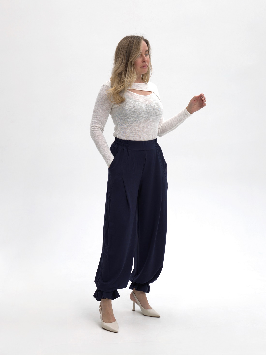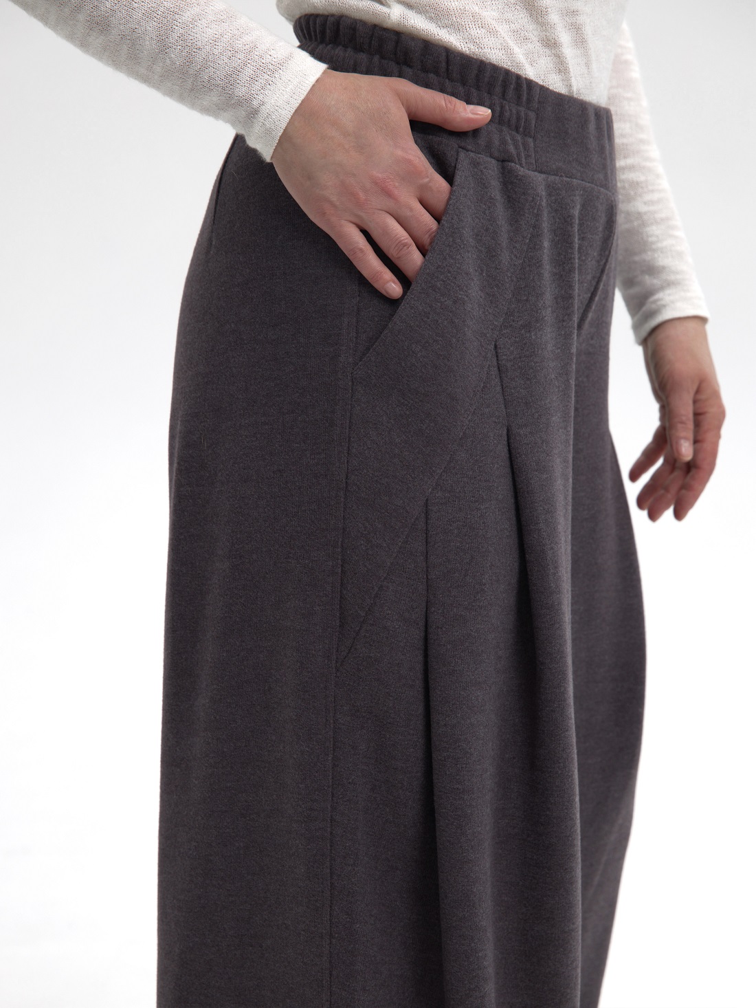 Брюки умеренного объёма с расширением к низу в стиле «палаццо». По переду