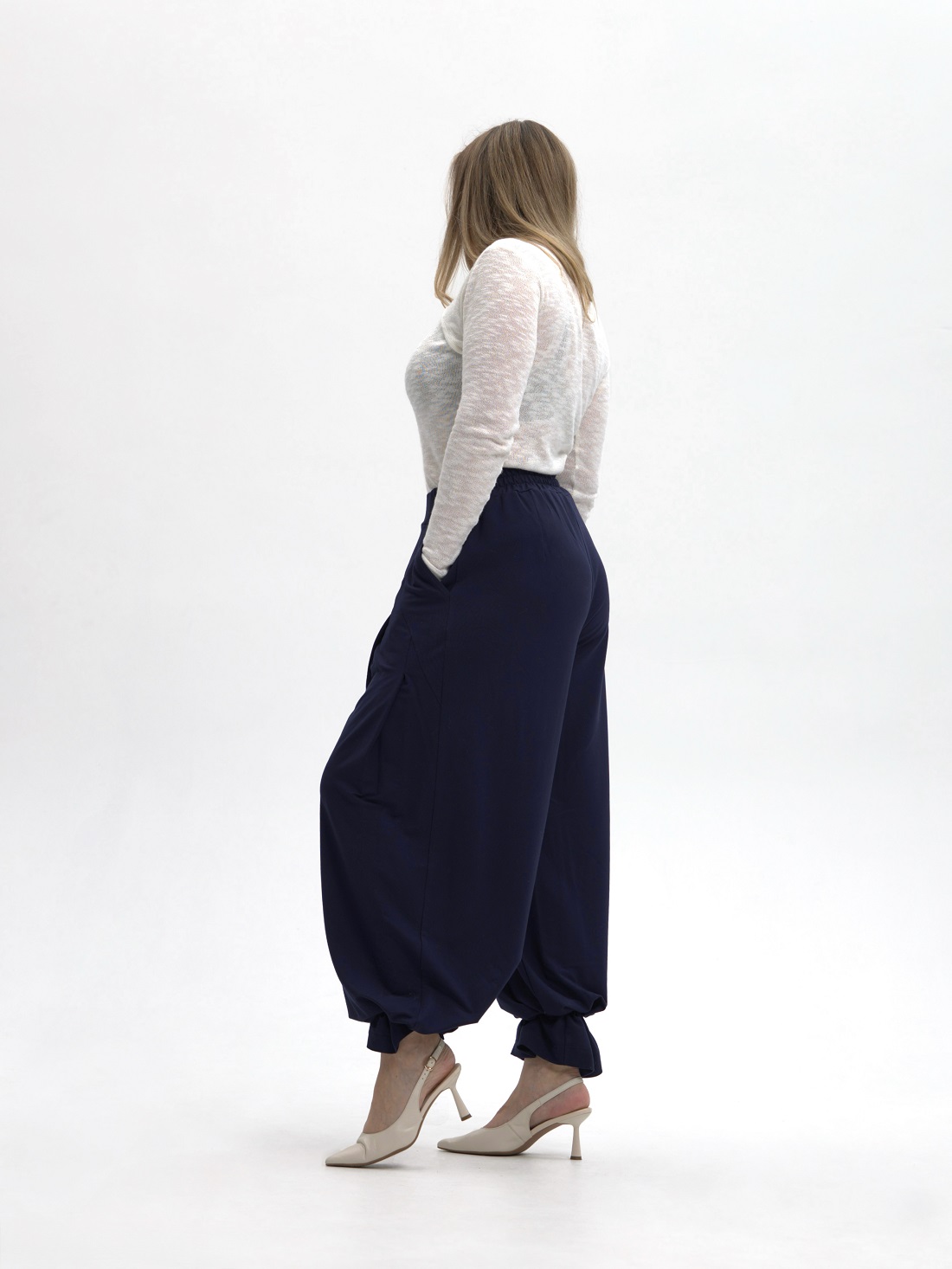 выполнены боковые карманы с наклонным входом и декоративной вставкой, от которой заложены две складки. Складки создают дополнительный объём и формируют выразительный внешний вид модели. По спинке предусмотрены вытачки. Пояс брюк комбинированный: передняя часть прямая, задняя на резинке.