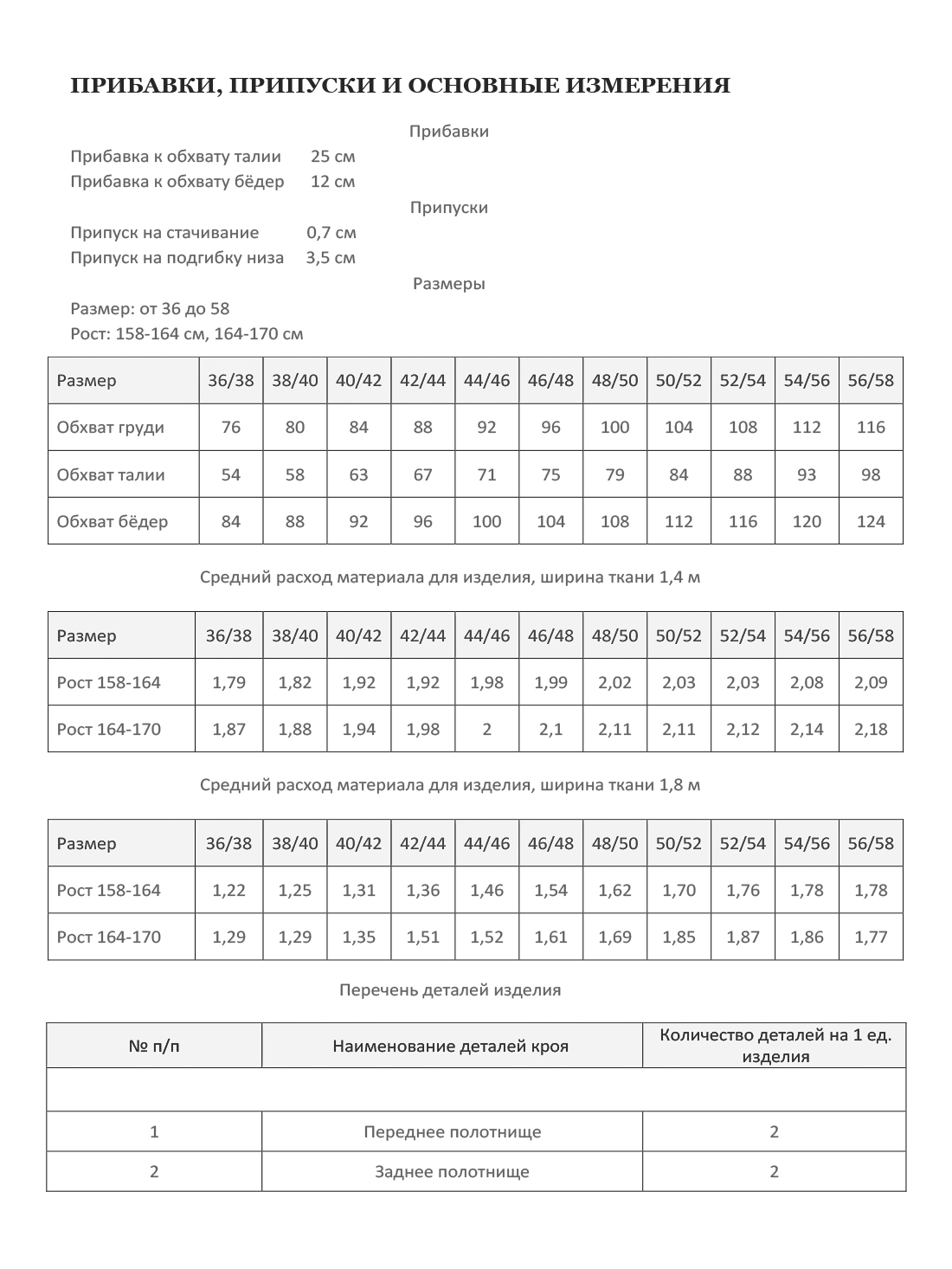 Техническая документация к лекалу включает в себя: описание пошива, прибавки, припуски и основные измерения в модели, средний расход материалов, раскладку на ткани.