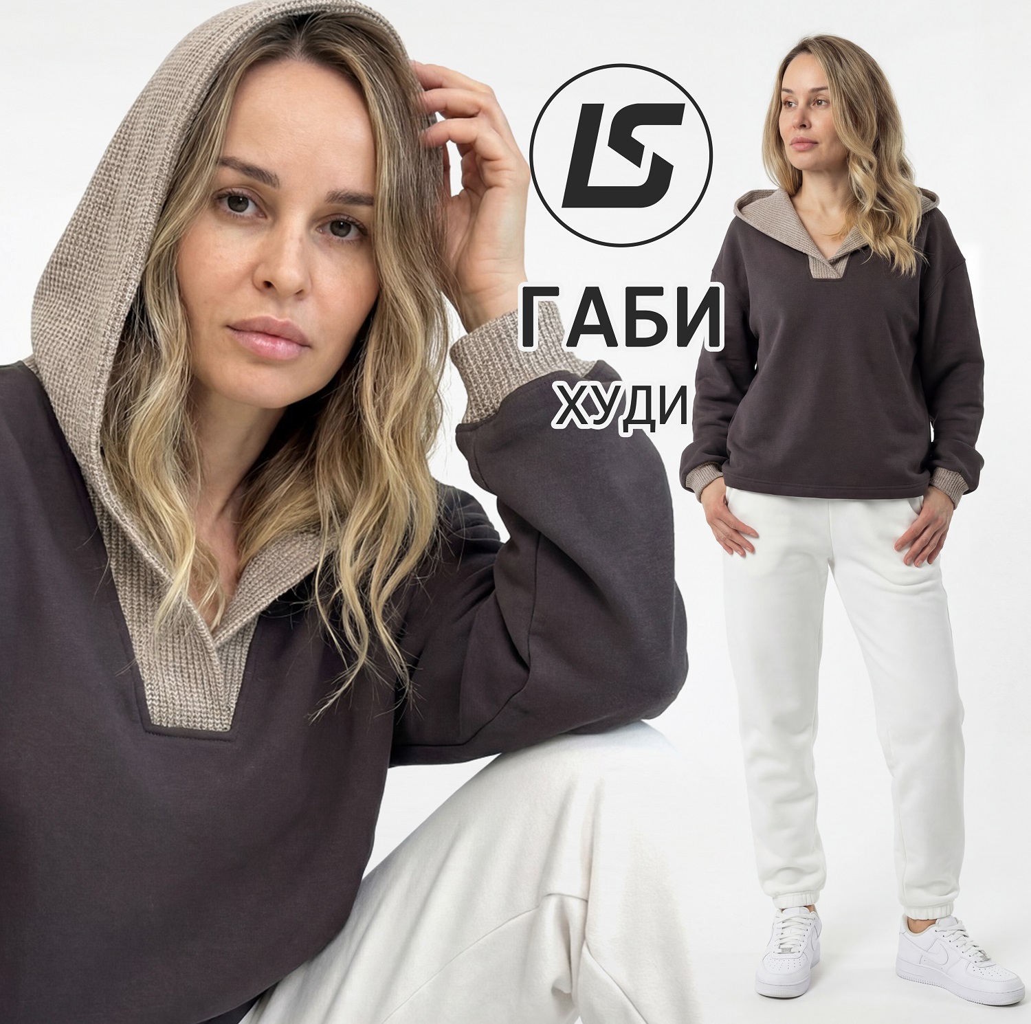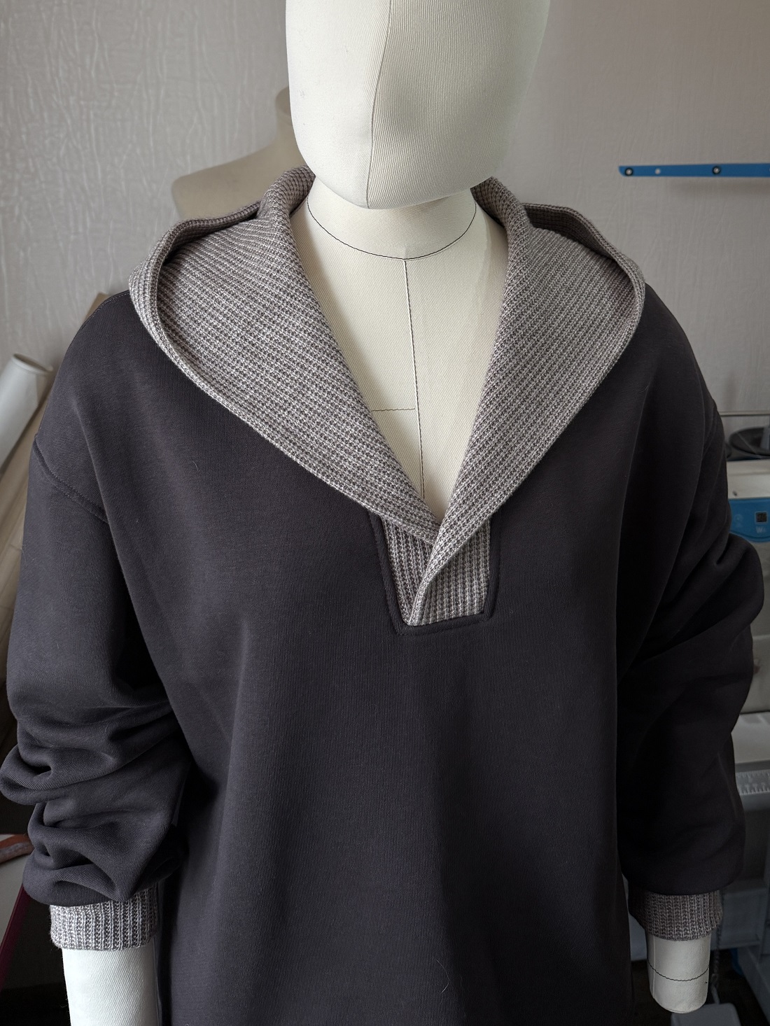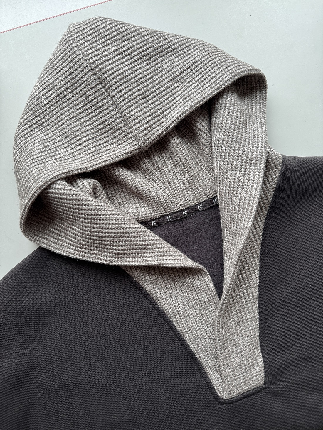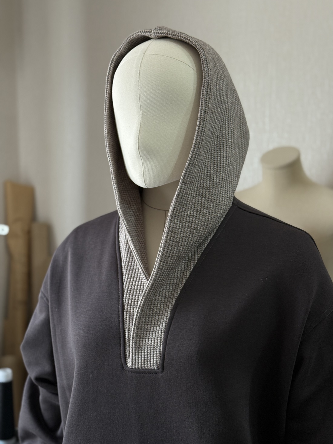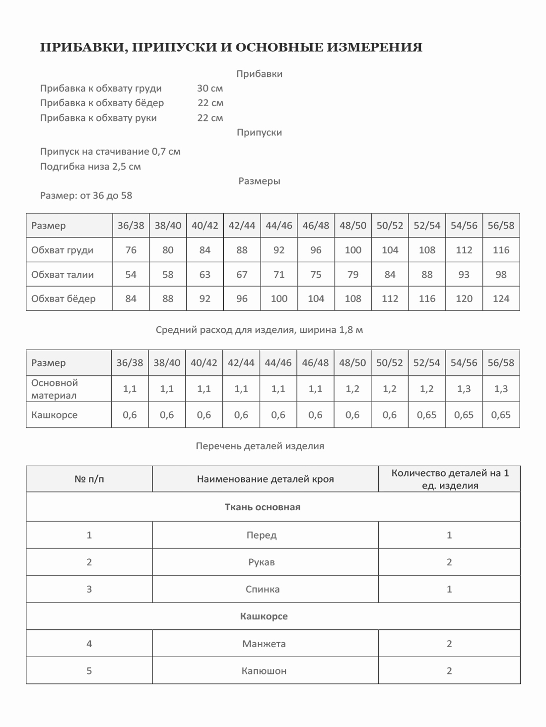 Модель свободного силуэта с втачным рукавом и спущенной линией плеча. Низ рукава на манжете из кашкорсе. Капюшон с углублённой V-образной линией входа втачан по горловине с нахлестом. Капюшон может быть выполнен из основной ткани либо из кашкорсе или вязаного полотна. Низ худи прямой с подгибом, при желании низ изделия можно сделать на резинке с утяжкой или притачать кашкорсе.