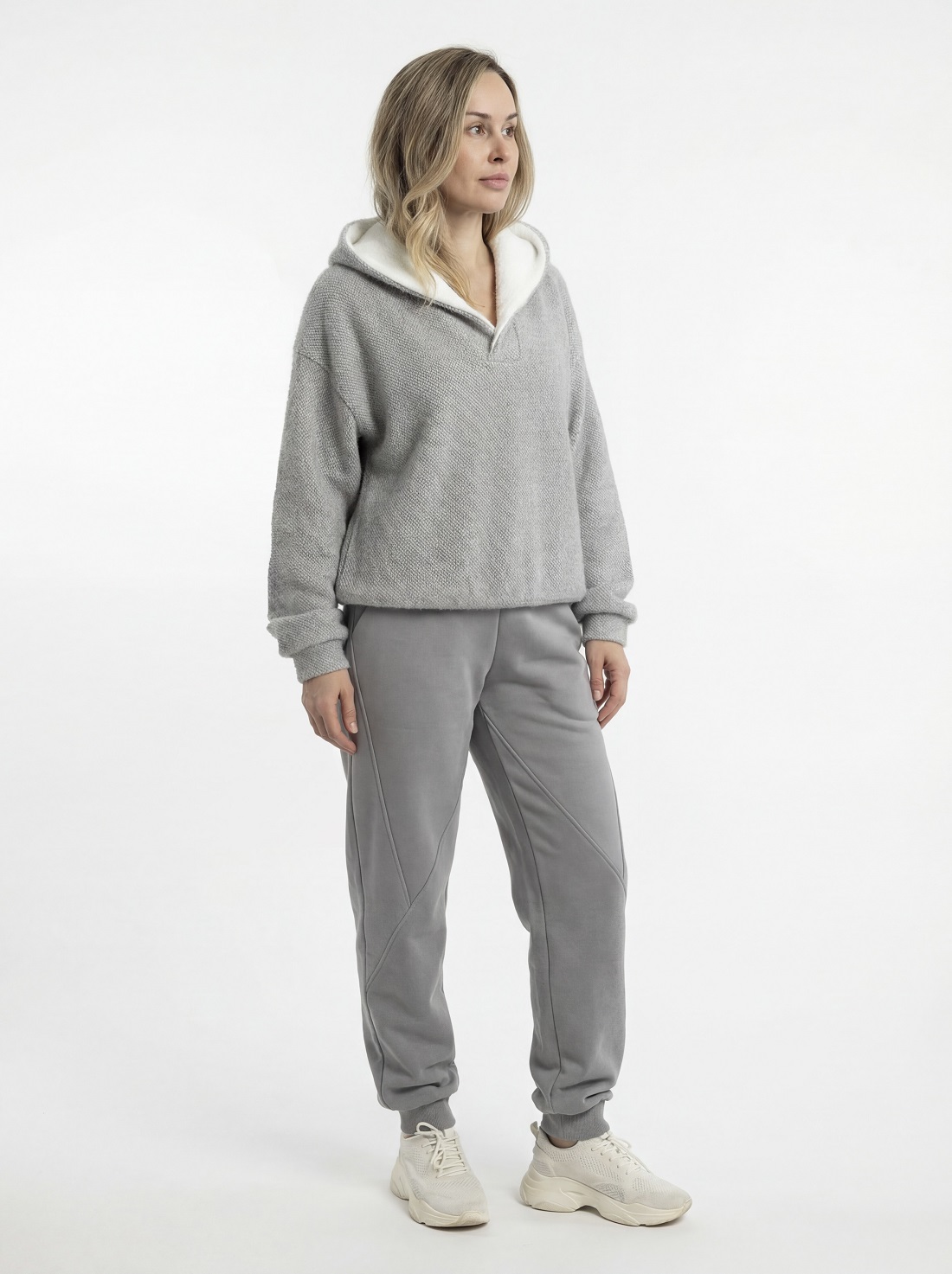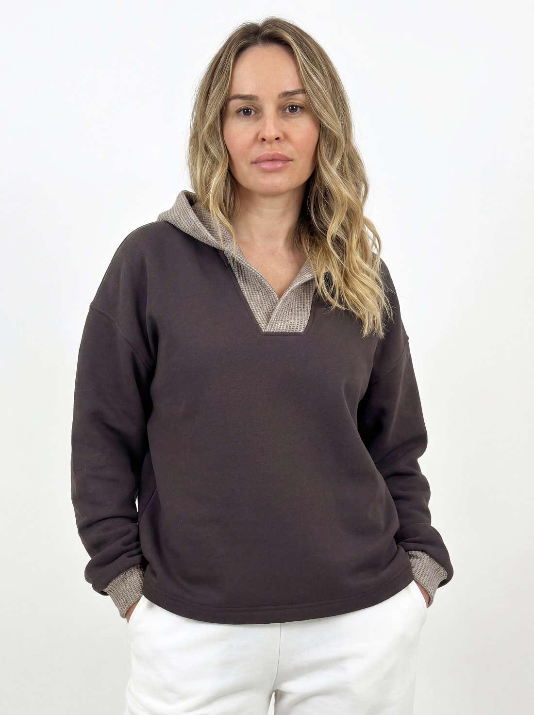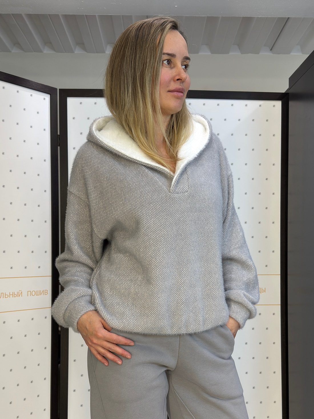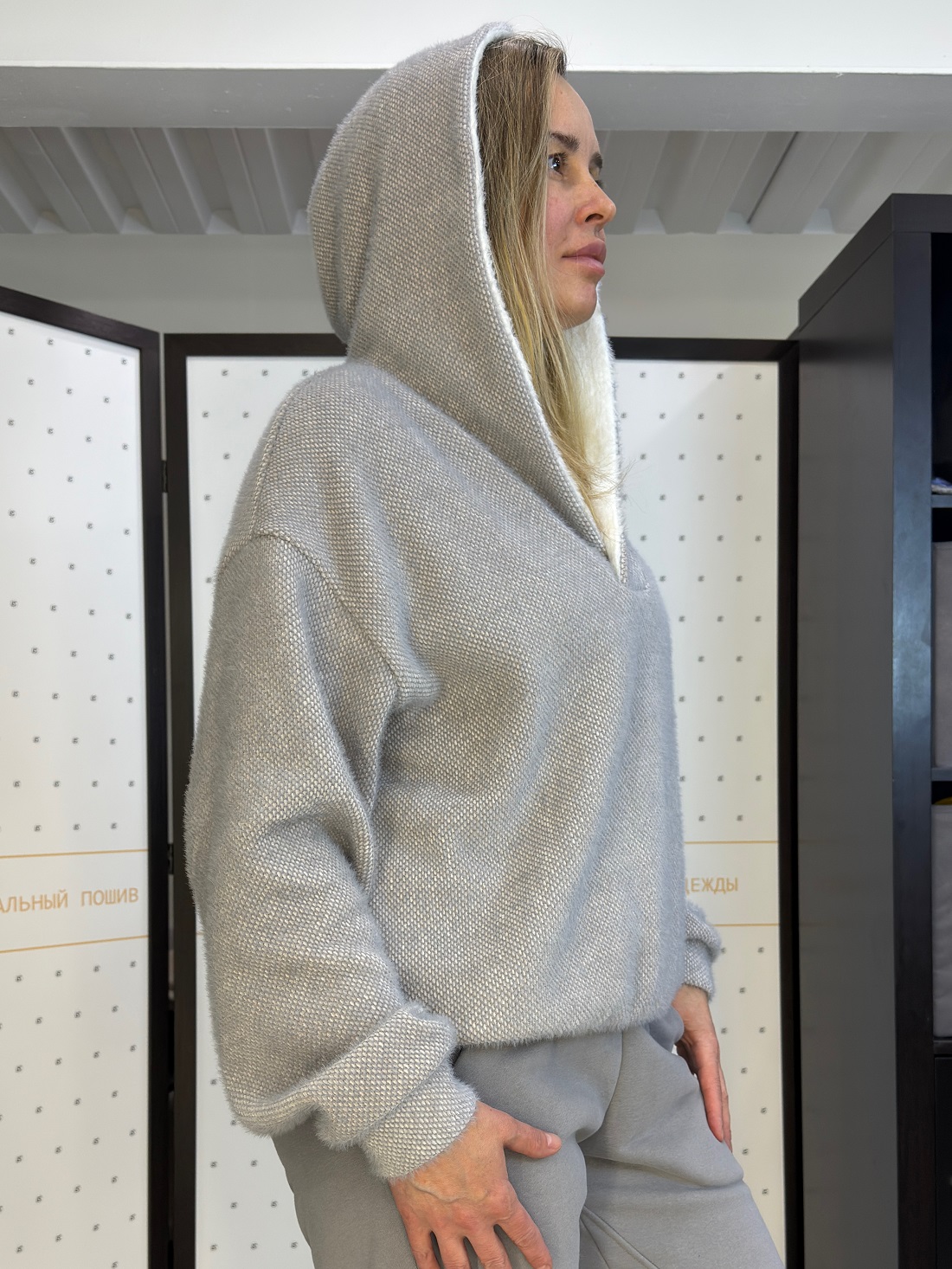 Модель свободного силуэта с втачным рукавом и спущенной линией плеча. Низ рукава на манжете из кашкорсе. Капюшон с углублённой V-образной линией входа втачан по горловине с нахлестом. Капюшон может быть выполнен из основной ткани либо из кашкорсе или вязаного полотна. Низ худи прямой с подгибом, при желании низ изделия можно сделать на резинке с утяжкой или притачать кашкорсе.