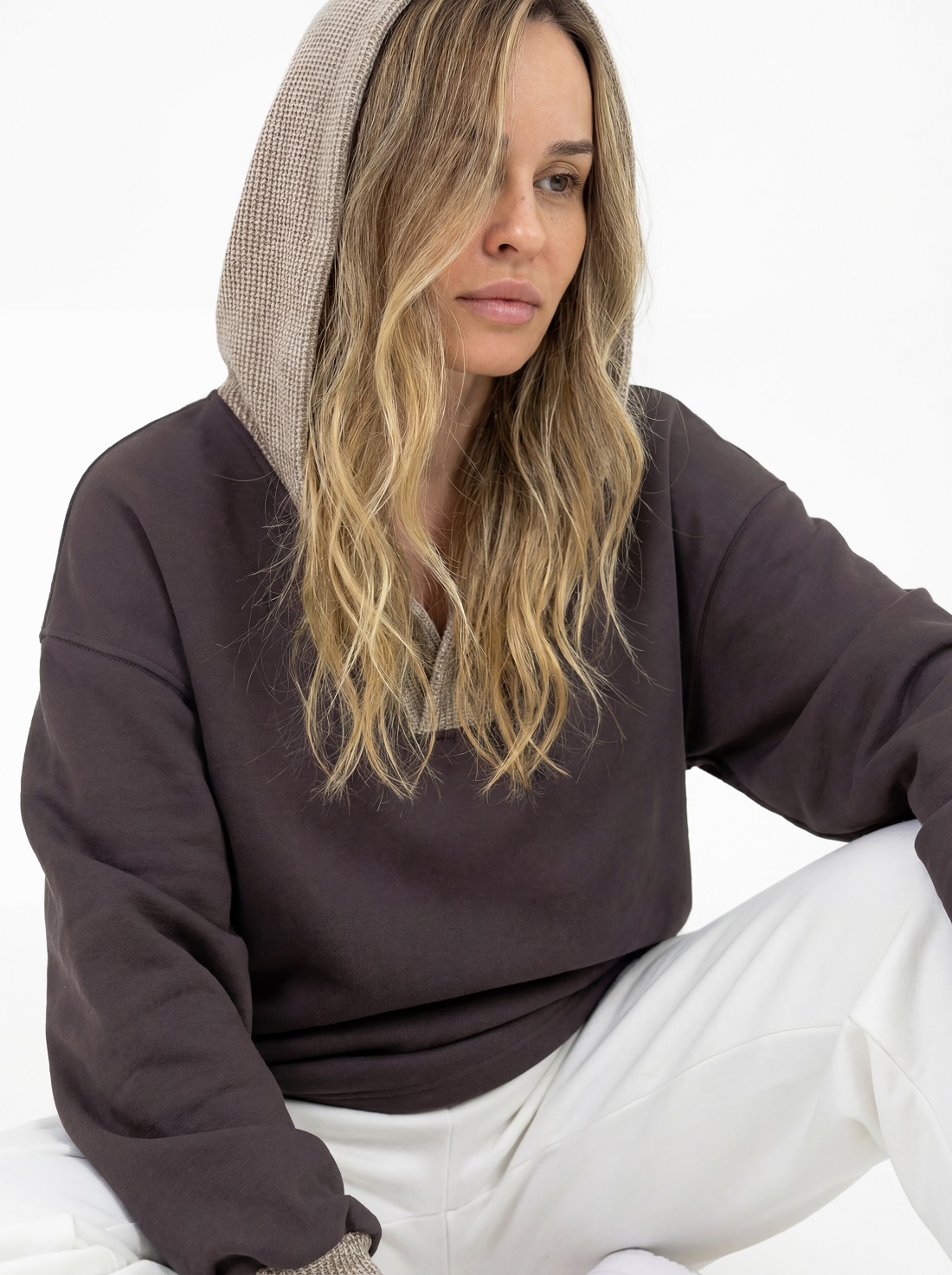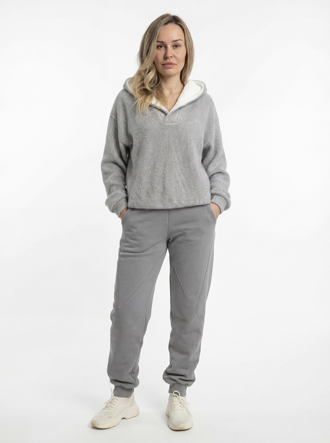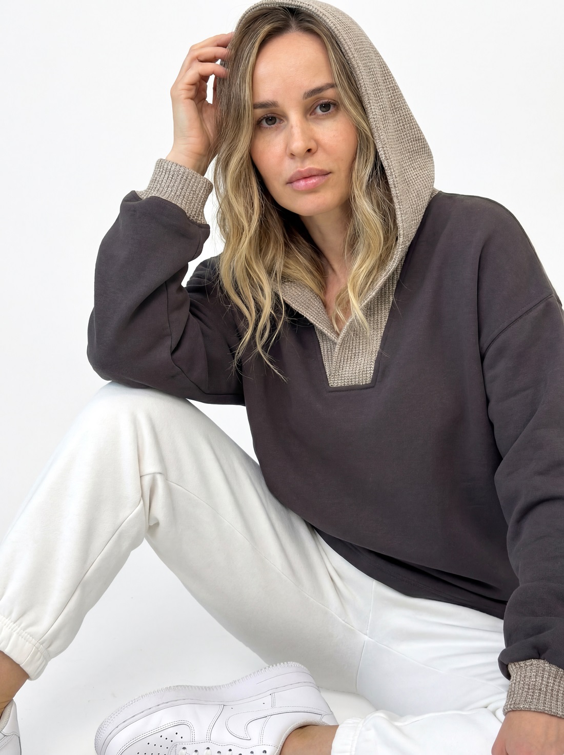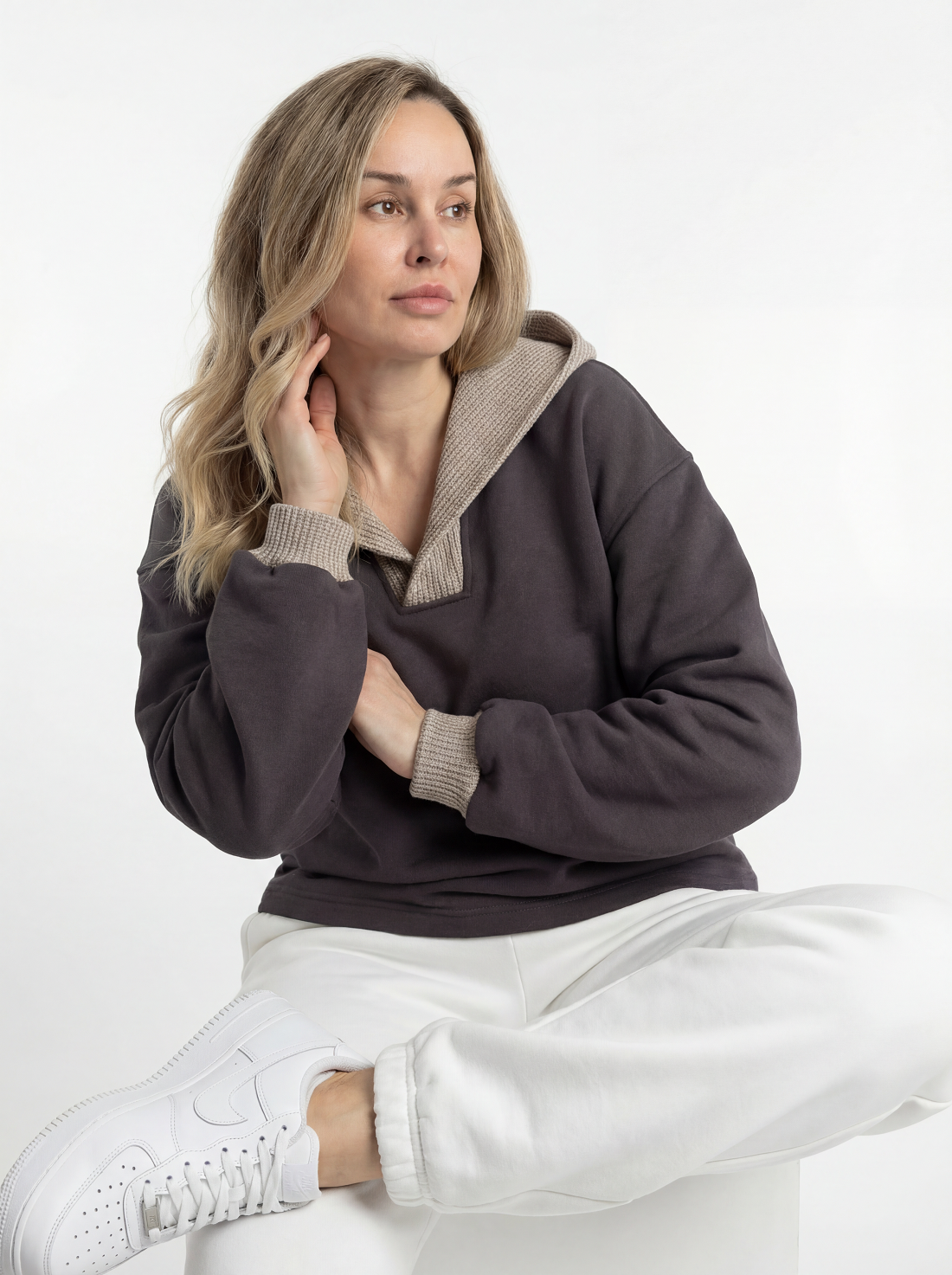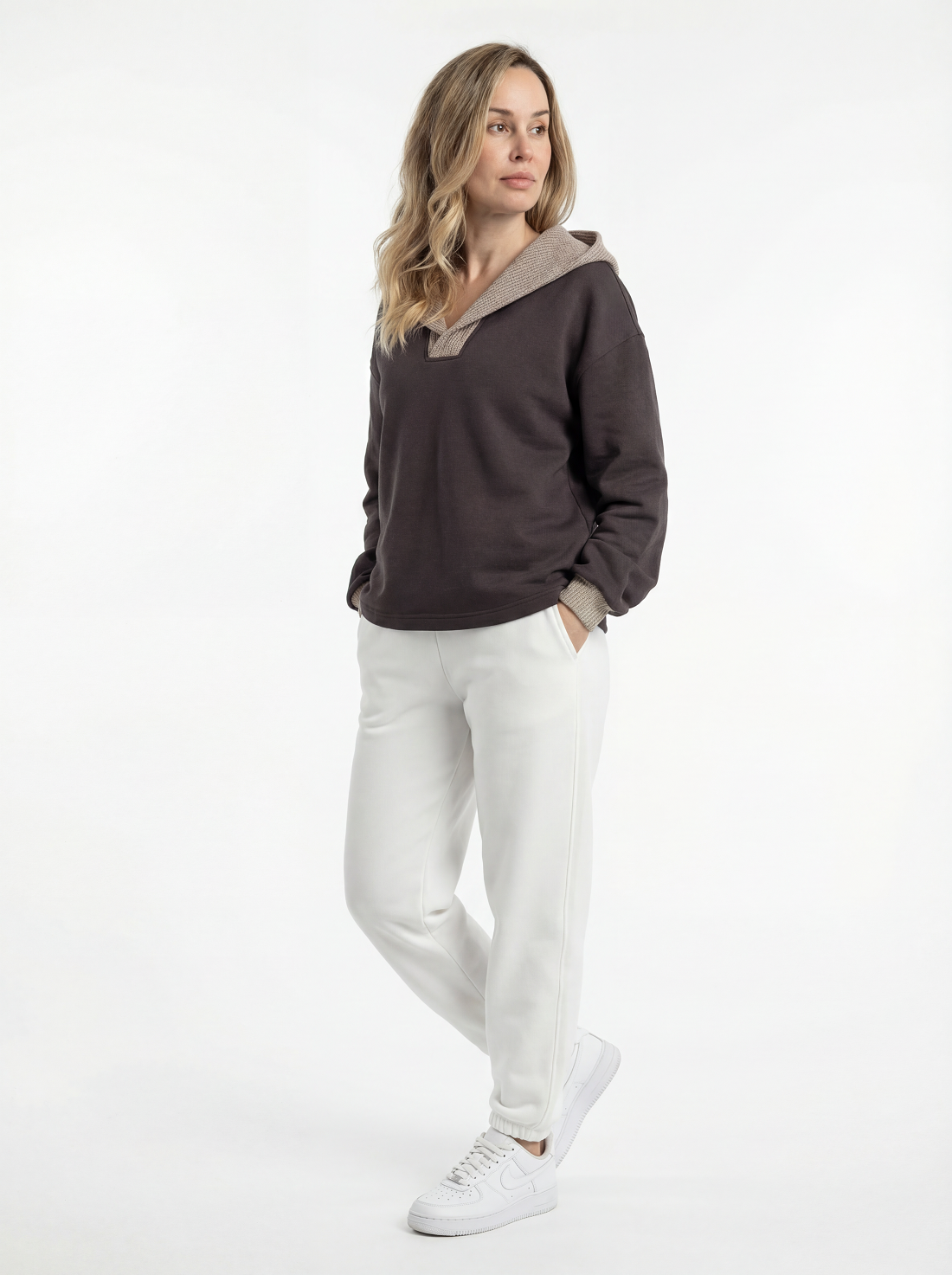 Модель свободного силуэта с втачным рукавом и спущенной линией плеча. Низ рукава на манжете из кашкорсе. Капюшон с углублённой V-образной линией входа втачан по горловине с нахлестом. Капюшон может быть выполнен из основной ткани либо из кашкорсе или вязаного полотна. Низ худи прямой с подгибом, при желании низ изделия можно сделать на резинке с утяжкой или притачать кашкорсе.
