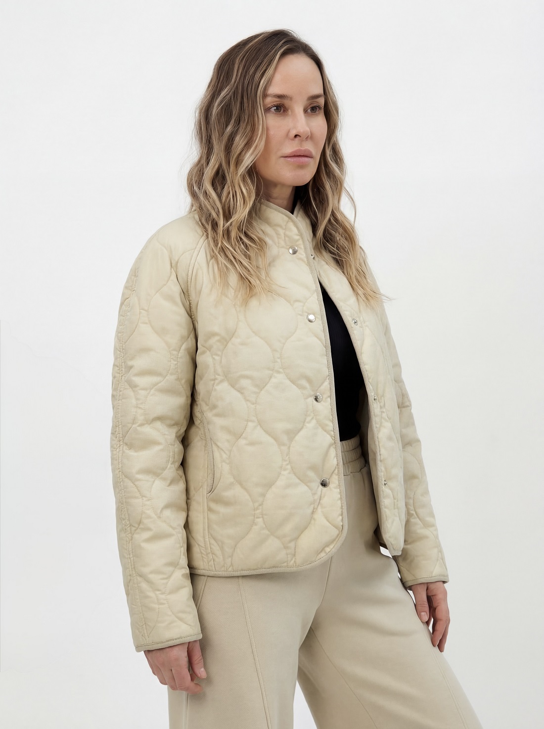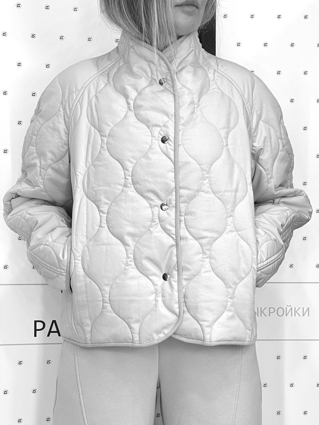 Куртка умеренного объёма с рукавом реглан, переходящим в воротник-стойку.