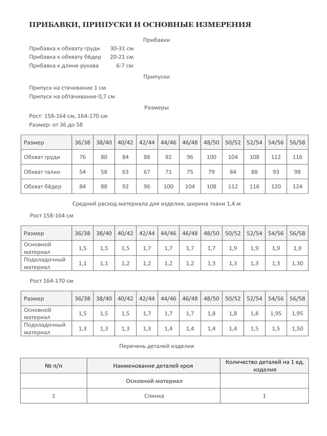 Техническая документация к лекалу включает в себя: описание пошива, прибавки, припуски и основные измерения в модели, средний расход материалов, раскладку на ткани.