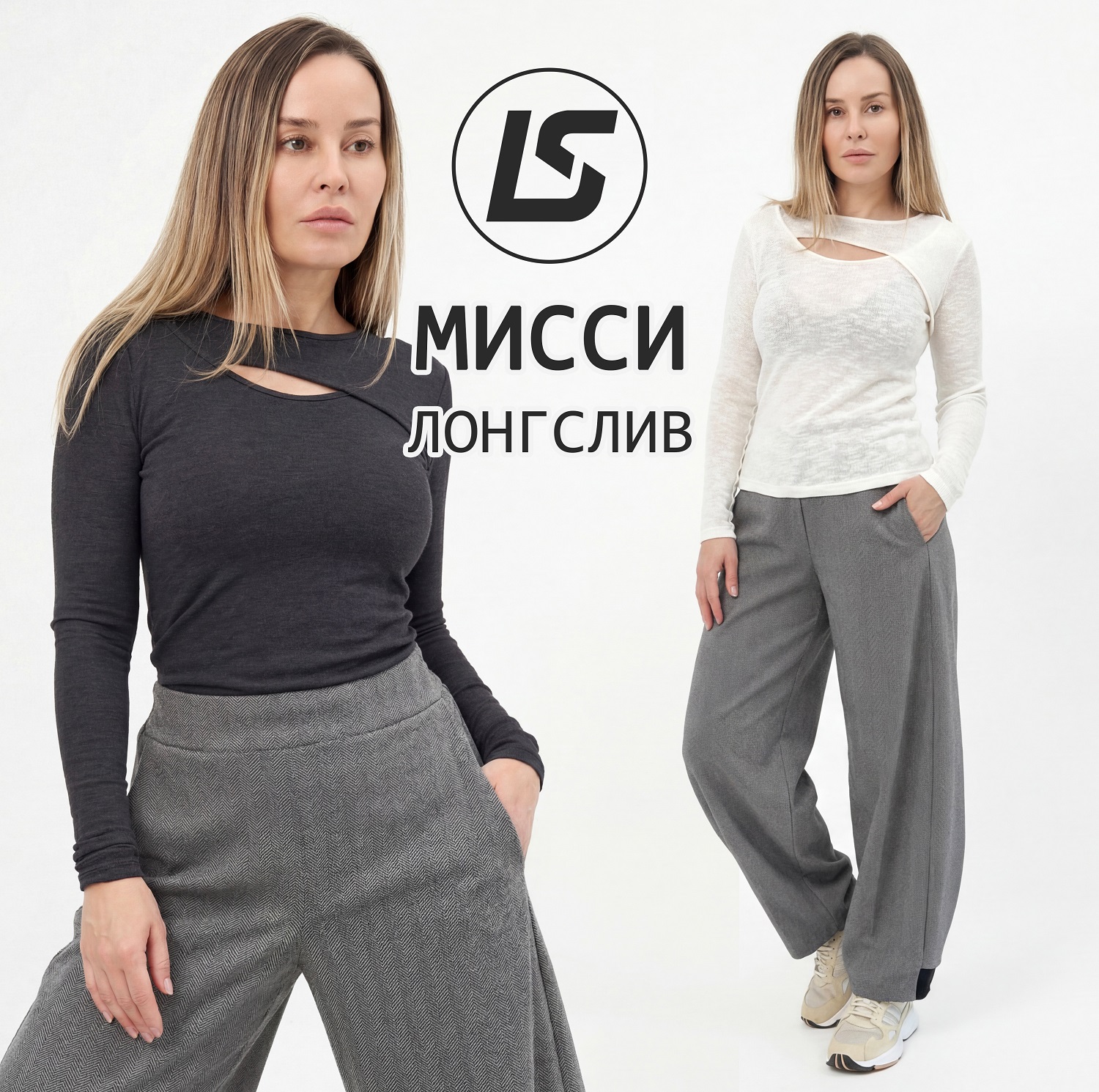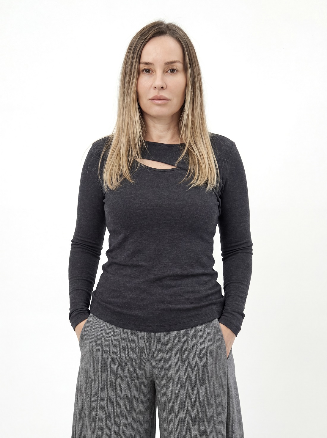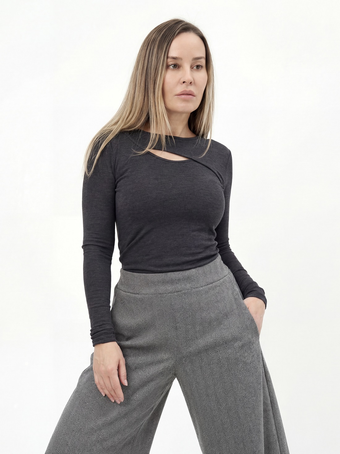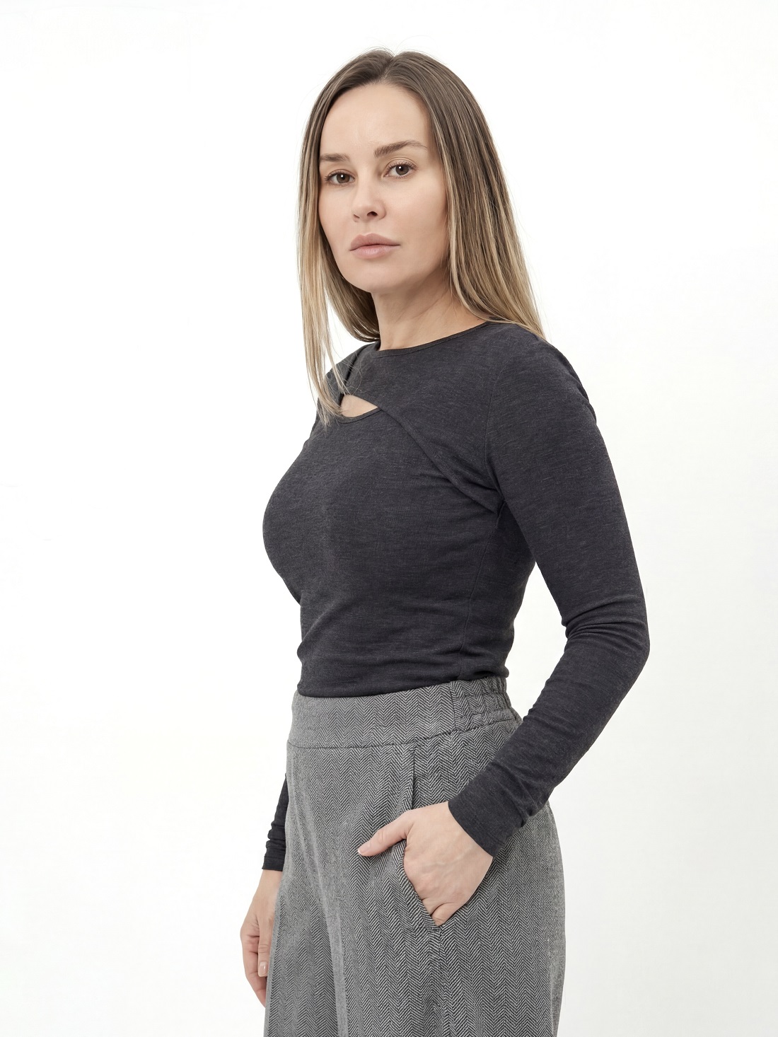 Лонгслив с декоративным вырезом на груди.