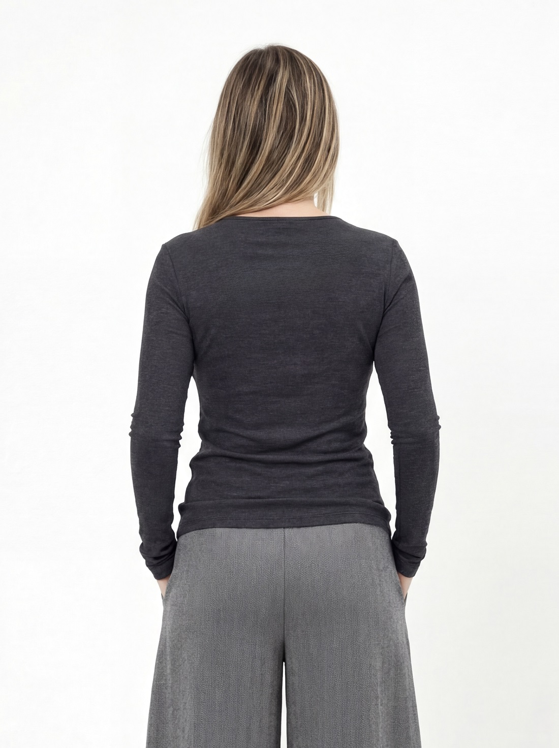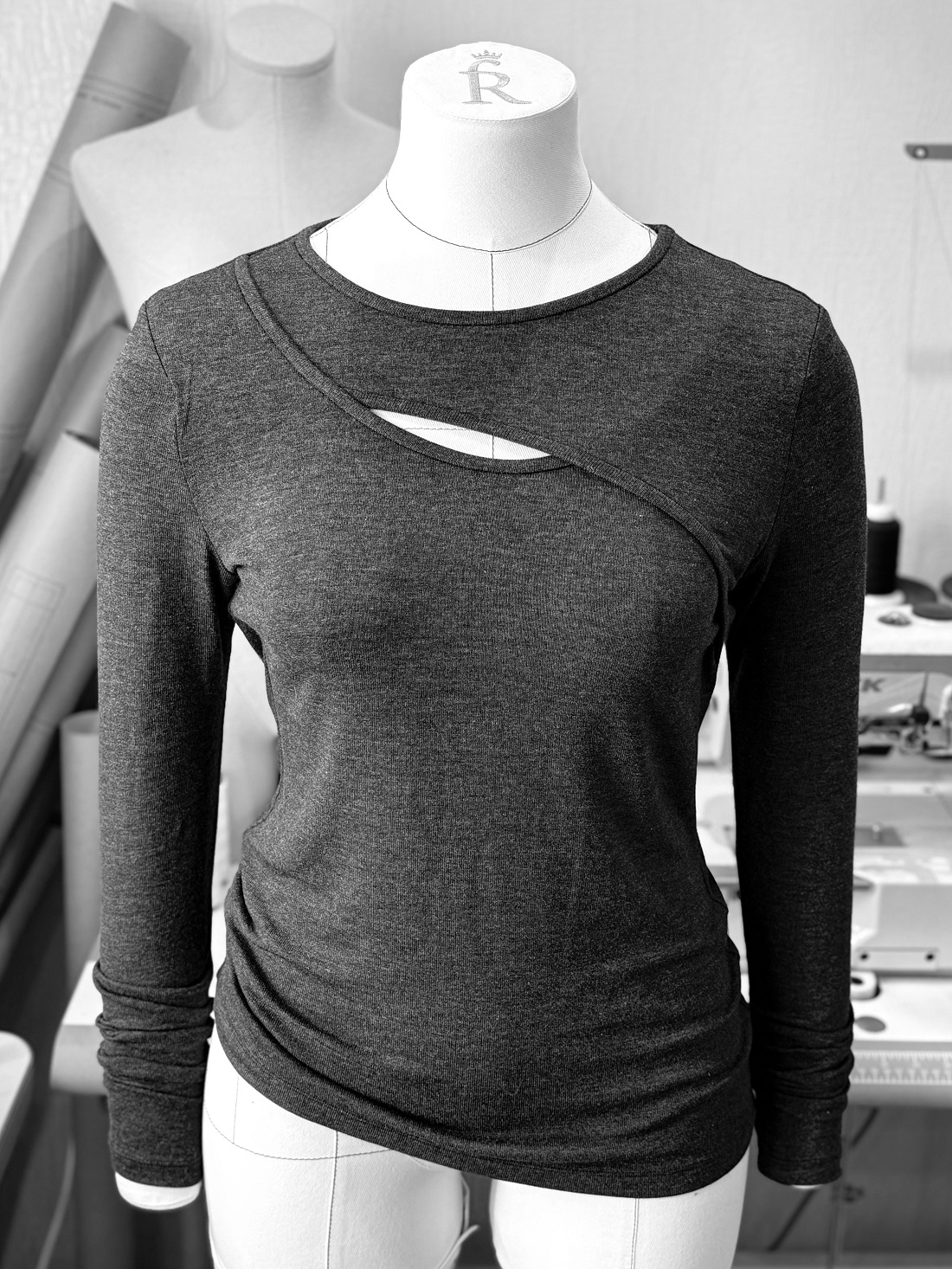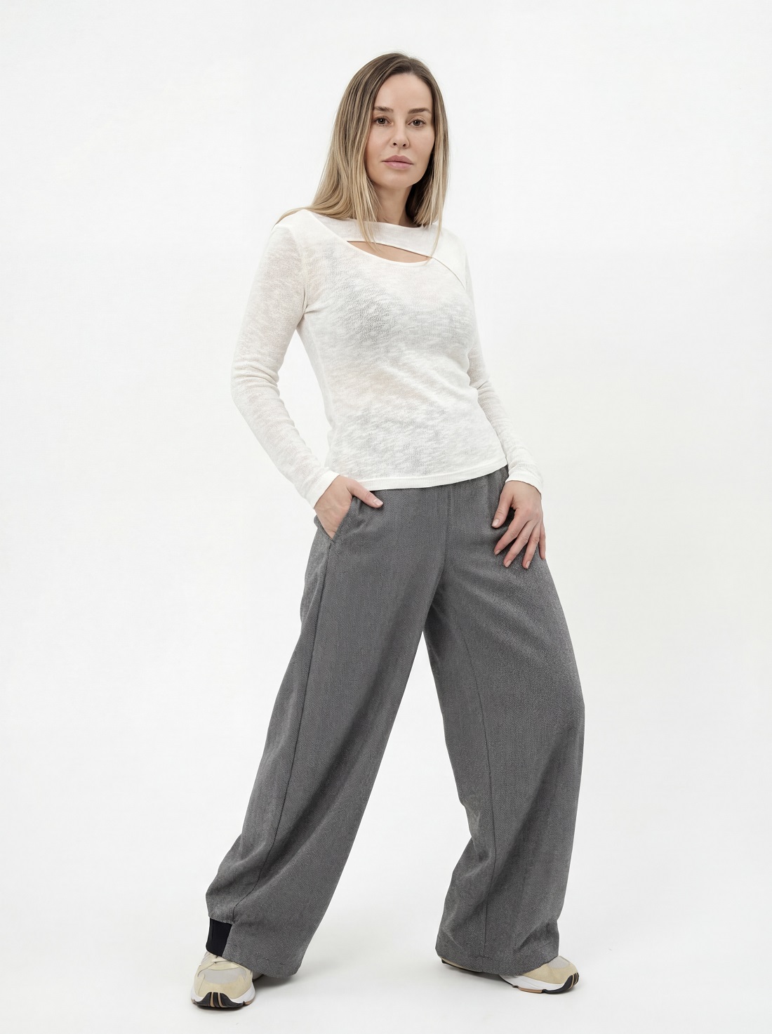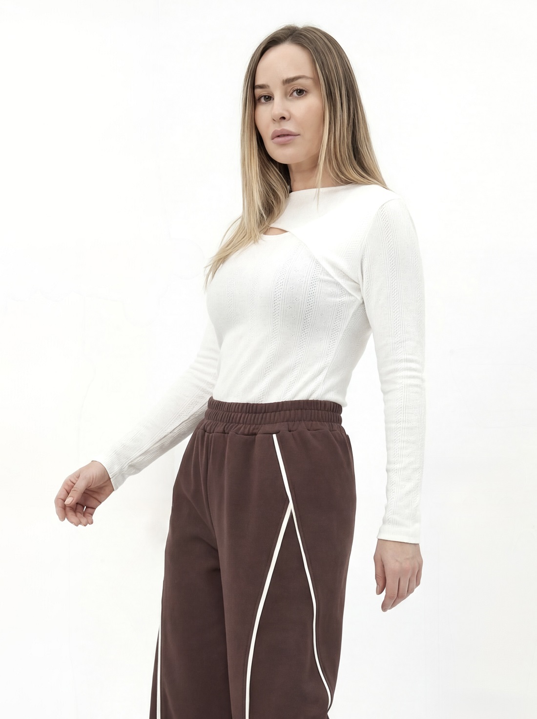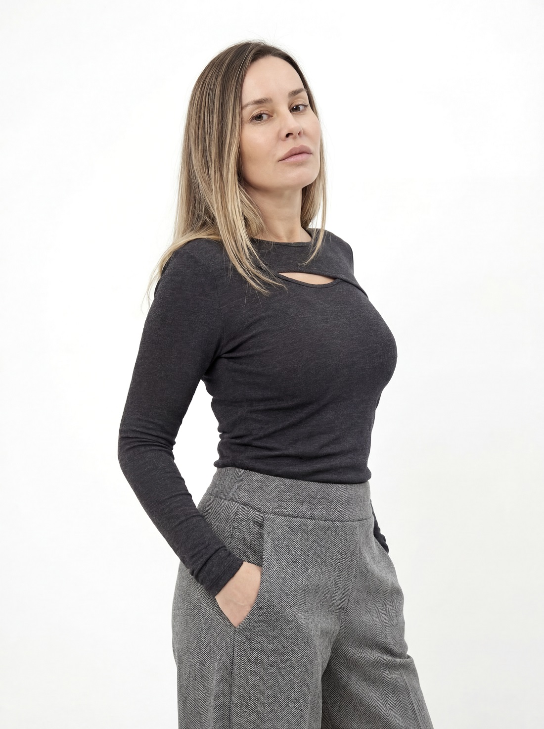 Лонгслив с декоративным вырезом на груди.