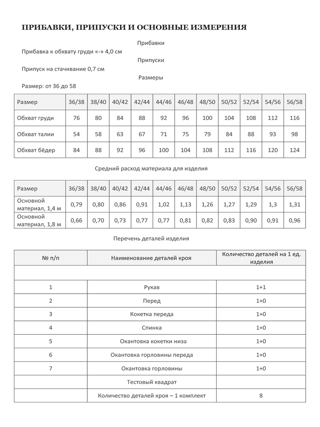 Техническая документация к лекалу включает в себя: описание пошива, прибавки, припуски и основные измерения в модели, средний расход материалов, раскладку на ткани.