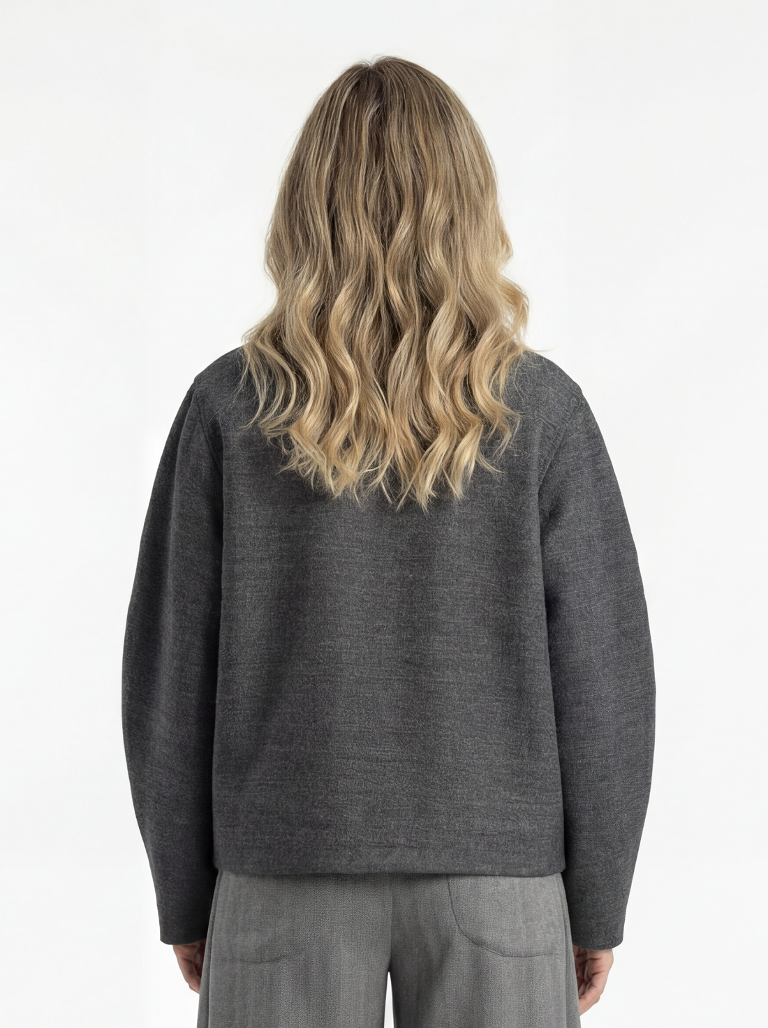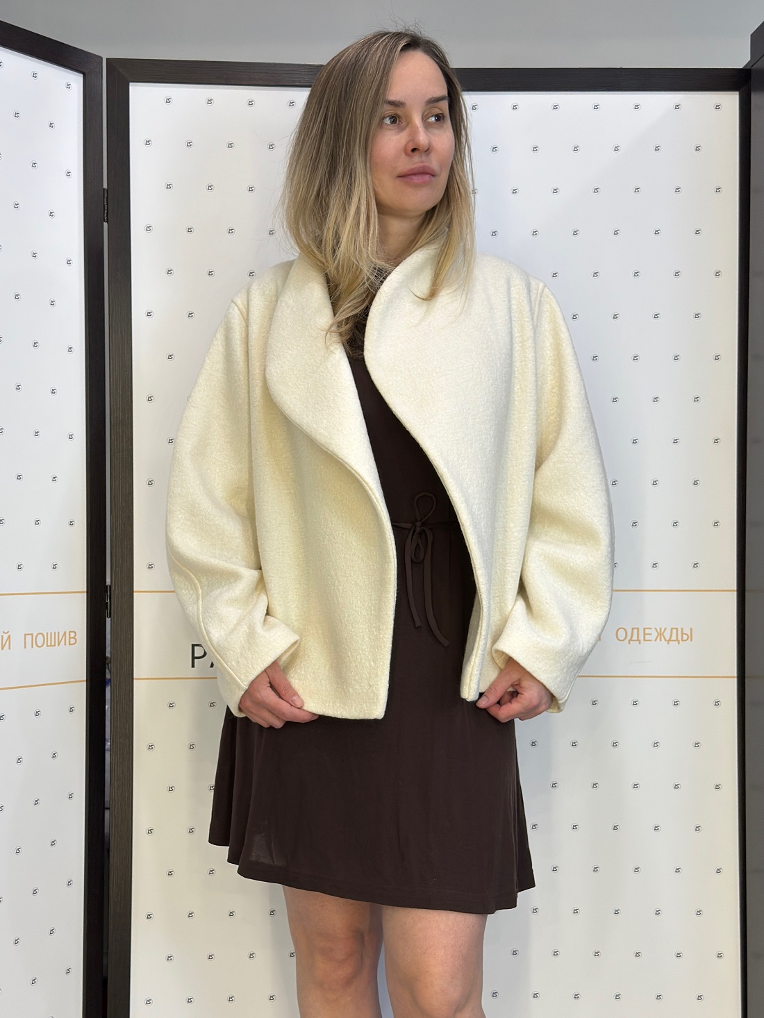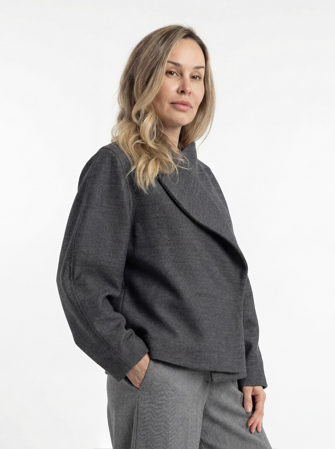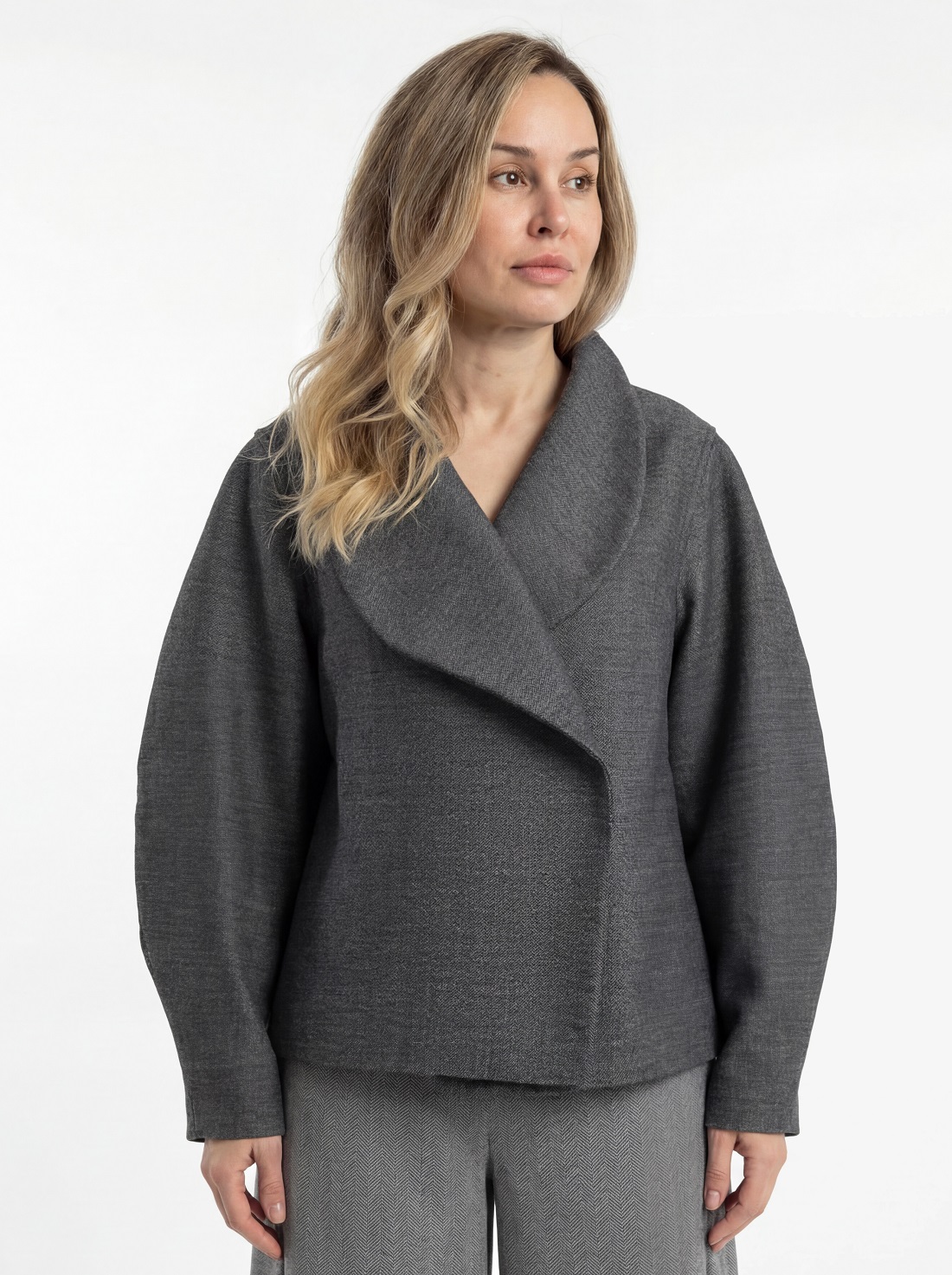 Модель умеренного объёма. Воротник невысокий, цельнокроеный с деталями переда и спинки. Линия горловины плавно переходит в запах с мягко скруглёнными лацканами. Подборт в нижней части выполнен со скосом, что формирует характерную линию запаха и подчёркивает силуэт модели. Рукав втачной, объёмный, имеет скругление в области локтя. Пройма углублённая. Модель с подкладкой. По желанию можно установить потайные кнопки в качестве застёжки.