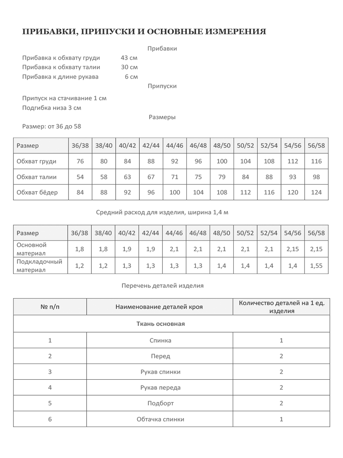 Техническая документация к лекалу включает в себя: описание пошива, прибавки, припуски и основные измерения в модели, средний расход материалов, раскладку на ткани.