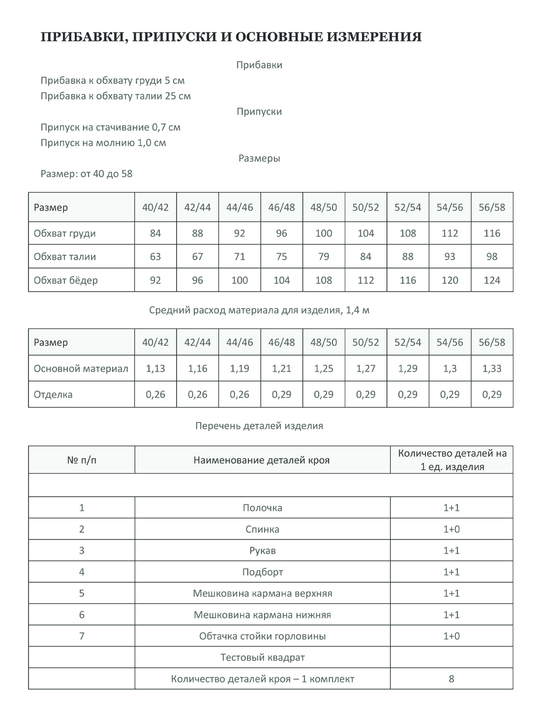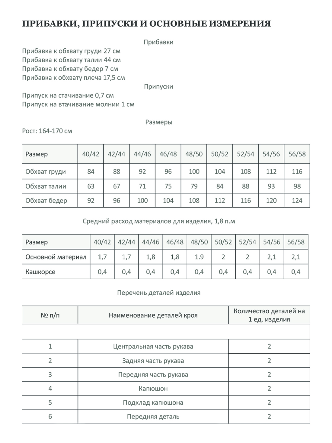 Техническая документация к лекалу включает в себя: описание пошива, прибавки, припуски и основные измерения в модели, средний расход материалов, раскладку на ткани.